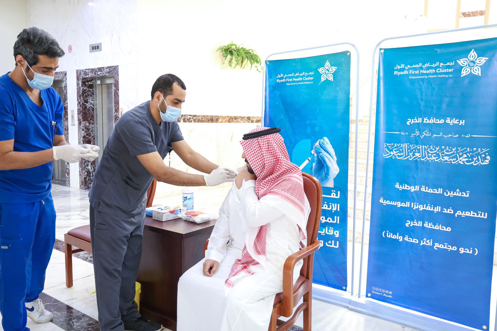 دشّن صاحب السمو الملكي الأمير فهد بن محمد بن سعد بن عبدالعزيز آل سعود، محافظ الخرج يوم الثلاثاء الموافق ١٤٤٦/٠٤/٠٥ هـ في بهو ديوان المحافظة حملة التطعيم ضد الإنفلونزا الموسمية، التي تستهدف جميع المواطنين والمقيمين في المحافظة.