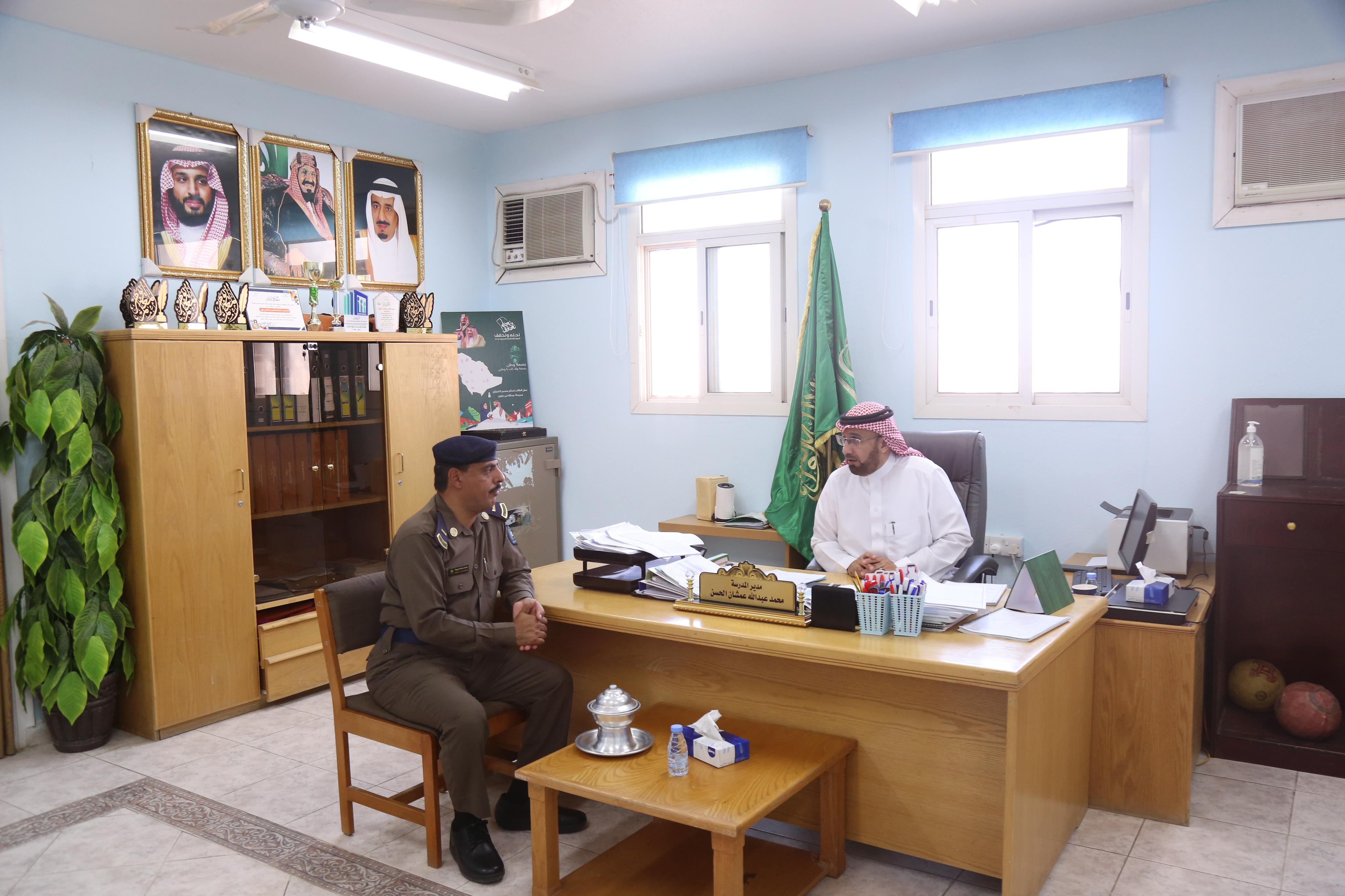 وكان في استقبالهم مدير المدرسة الأستاذ محمد عبدالله عمشان الحسن والذي رحب بهم واثنى على هذه الزيارة التي تعكس مدى حرص إدارة المدني و قطاعهم المهم في التوعية و التثقيف لأبنائنا الطلاب .