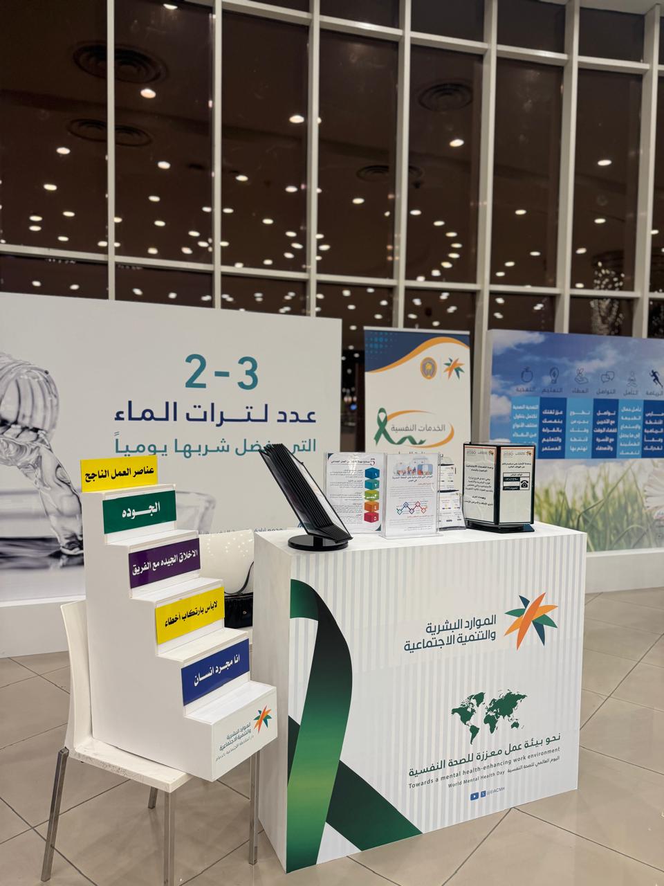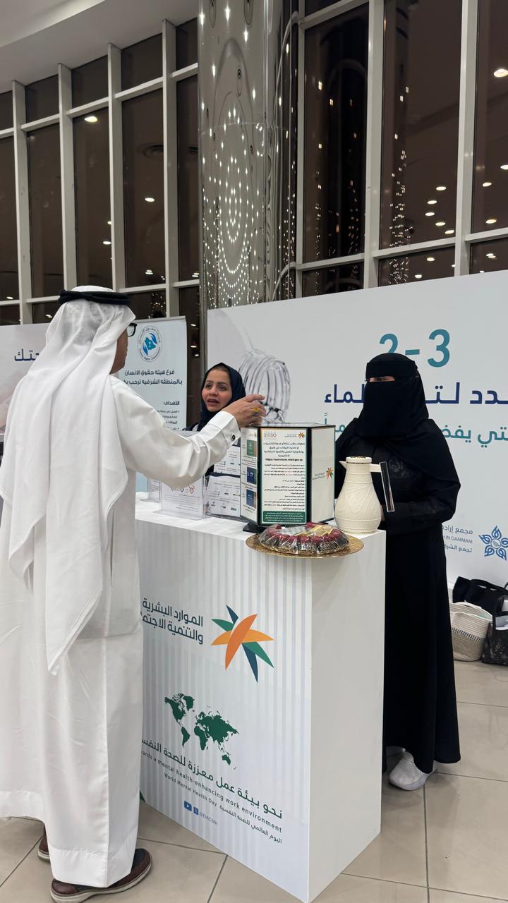 شارك فرع وزارة الموارد البشرية والتنمية الاجتماعية بالمنطقة الشرقية، في فعاليات اليوم العالمي للصحة النفسية، التي نظمها مجمع إرادة والصحة النفسية بالدمام، أحد مكونات تجمع الشرقية الصحي، وتستمر الفعاليات لمدة 7 أيام، تحت شعار: "نحو بيئة عمل معززة للصحة النفسية".