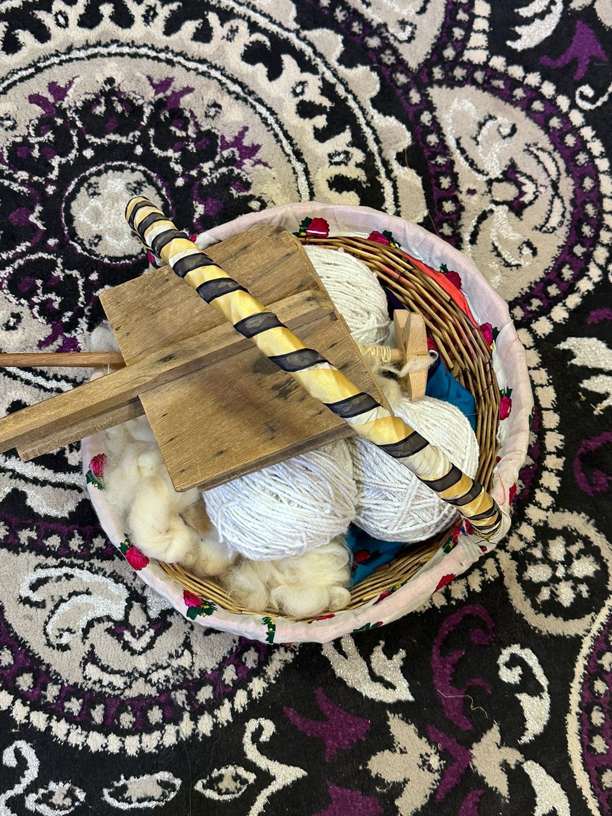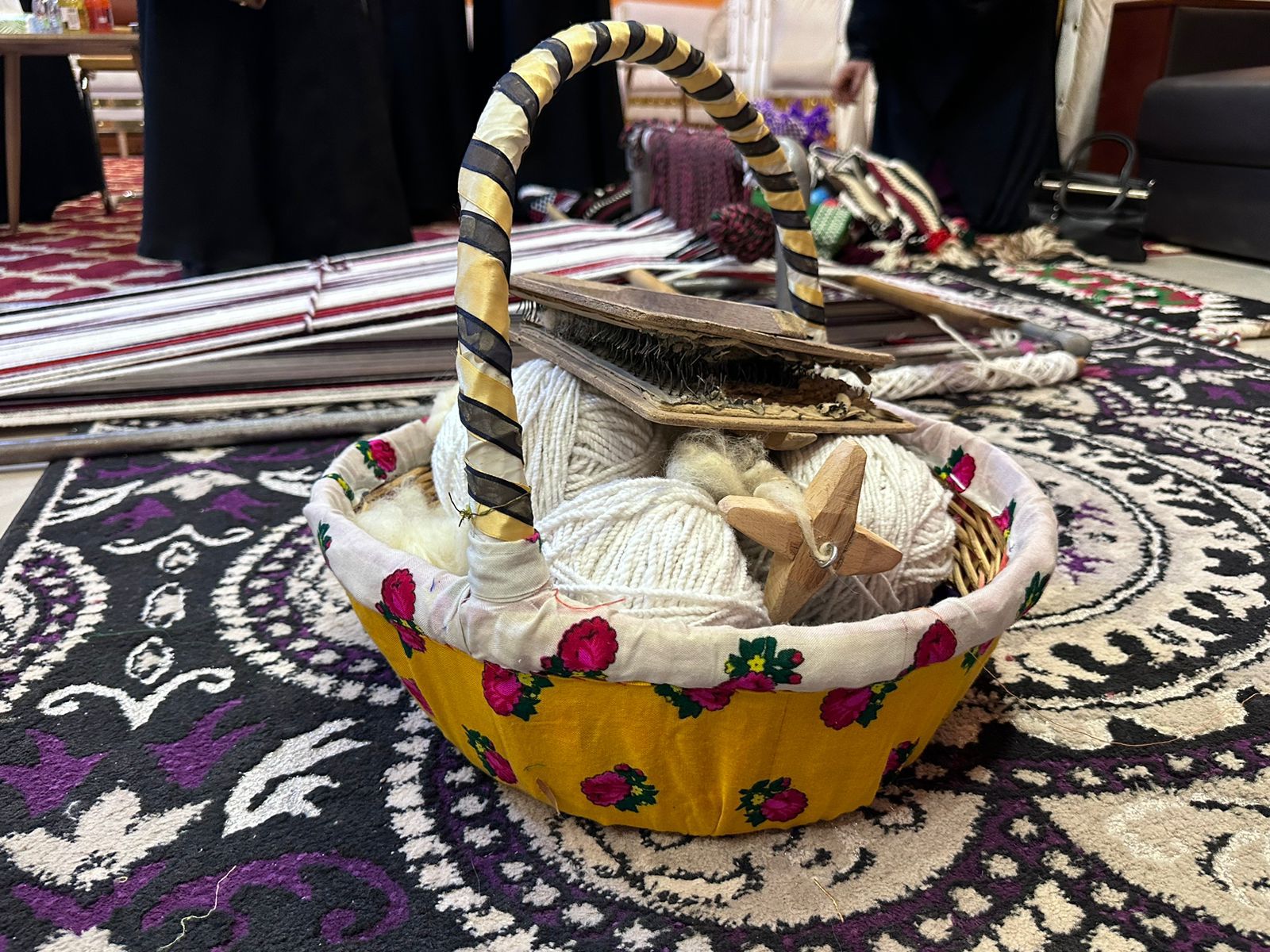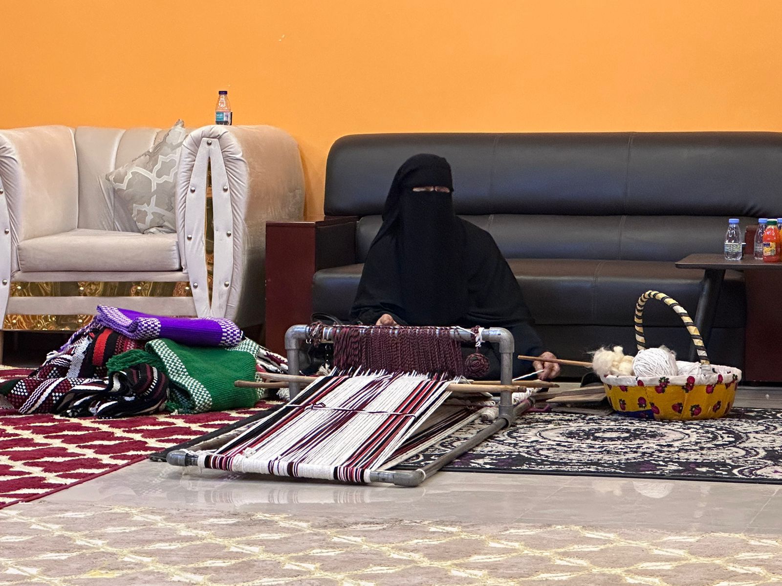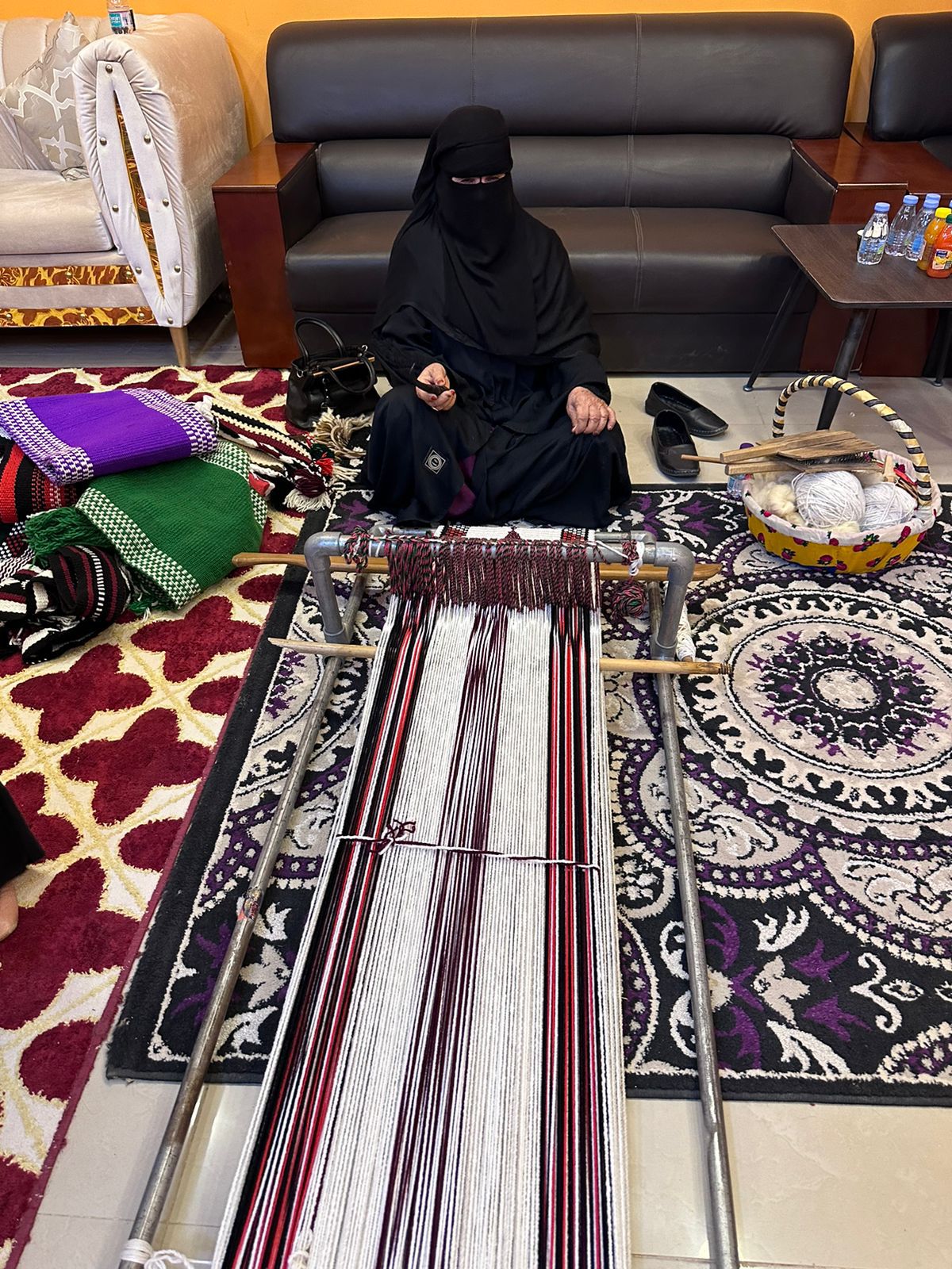 بعد ذلك تطرقت لحرفة السدو والنسيج من بداية جز الصوف وغسيله ثم تجفيفه وبعد ذلك غزله بالمغزل وتحويله لخيوط جاهزه لعملية النسيج وصناعة بيوت الشعر .