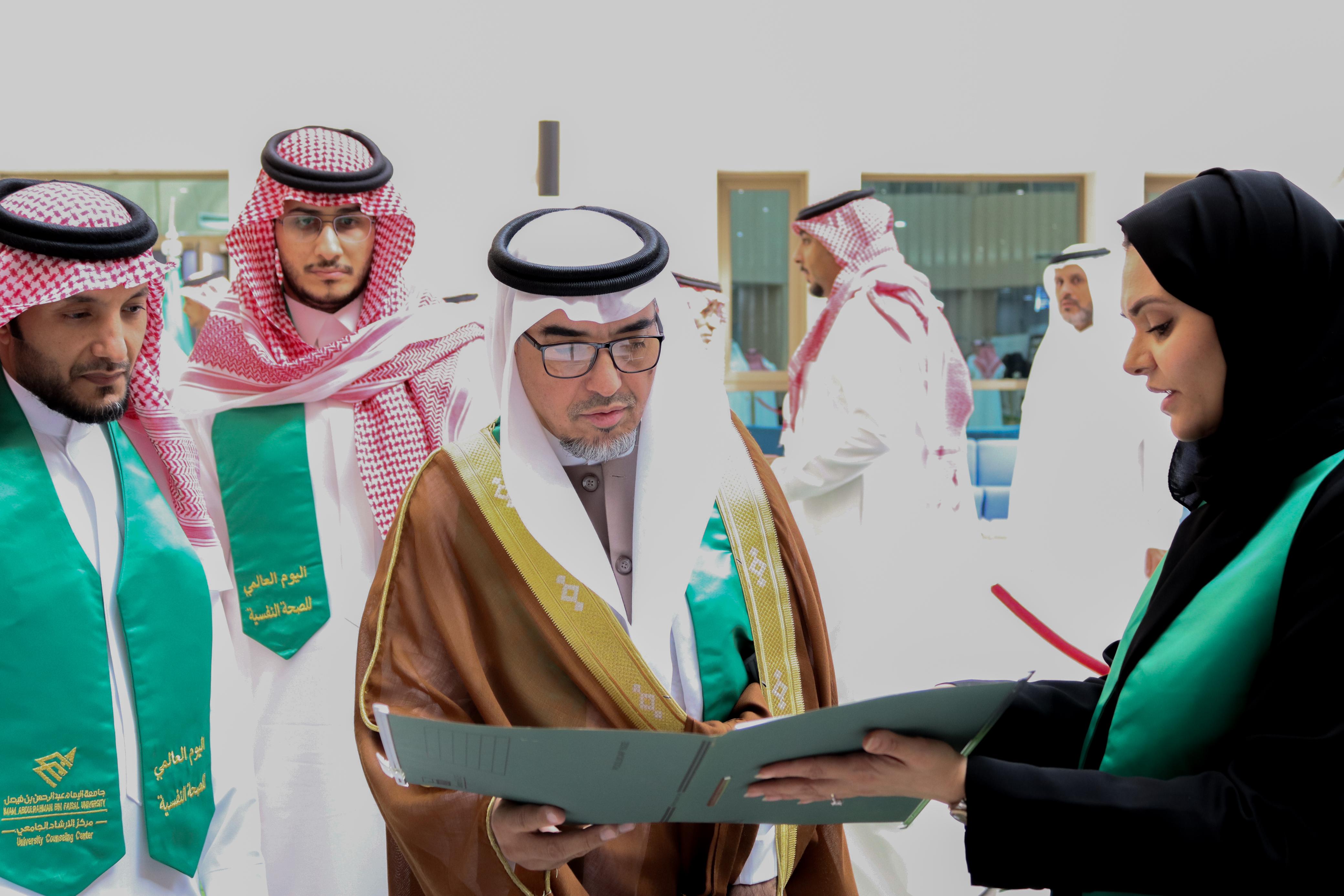 برعاية رئيس جامعة الإمام عبد الرحمن بن فيصل افتتح نائب الرئيس للشؤون الإدارية والمالية أ.د.عبد الواحد المزروع فعالية اليوم العالمي للصحة النفسية والذي ينظمه مركز الإرشاد الجامعي بالجامعة ، بحضور مديرة المركز د.عبير رشيد وعمداء الكليات والمراكز.