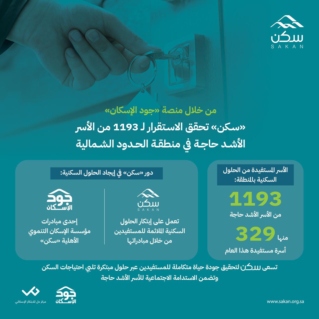 في إطار رؤيتها الرامية إلى ريادة وتمكين قطاع الإسكان غير الربحي، أسهمت مؤسسة الإسكان التنموي الأهلية “سكن” ممثلةً في منصة “جود الإسكان”، في توفير حلول سكنية في منطقة الحدود الشمالية لـ 1193 أسر مستحقة من الأسر الأشد حاجة، منها 329 أسرة خلال العام الحالي. وذلك التزامًا من المؤسسة في تعزيز مفهوم الإسكان التنموي وتوفير الحلول السكنية للأسر الأشد احتياجاً في المجتمع.