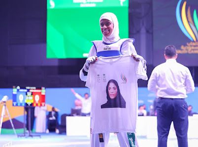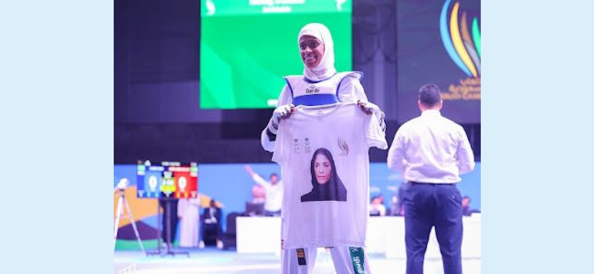 من جانبها، وفي لفتة معبرة، أطلقت النجمة دنيا أبوطالب فرحتها بالفوز في النزال النهائي، برفع قميص يحمل صورة الأميرة دليل بنت نهار آل سعود الرئيس التنفيذي لدورة الألعاب السعودية التي توجت الفائزات في منافسات سيدات التايكوندو.
