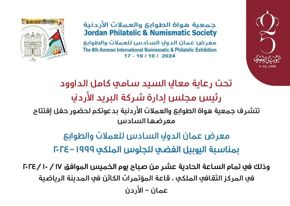 انطلقت فعاليات معرض عمان الدولي السادس للعملات والطوابع بمناسبة اليوبيل الفضي للجلوس الملكي ١٩٩٩ _ ٢٠٢٤ .والذي تنظمه جمعية هواة الطوابع والعملات الاردنية،