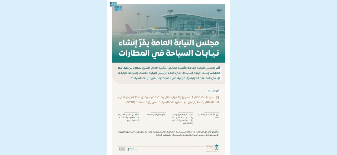 أقر مجلس النيابة العامة برئاسة معالي النائب العام الشيخ سعود بن عبدالله المعجب إنشاء "نيابة السياحة" في المقر الرئيس للنيابة العامة، والنيابات التابعة لها في المطارات الدولية والإقليمية في المملكة بمسمى "نيابات السياحة".