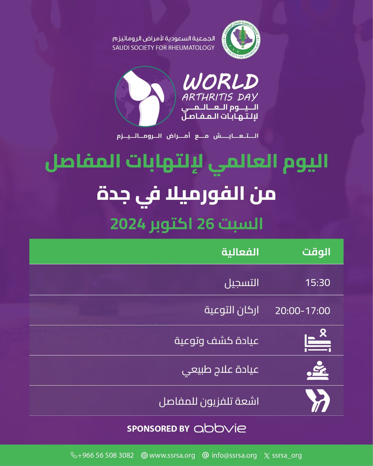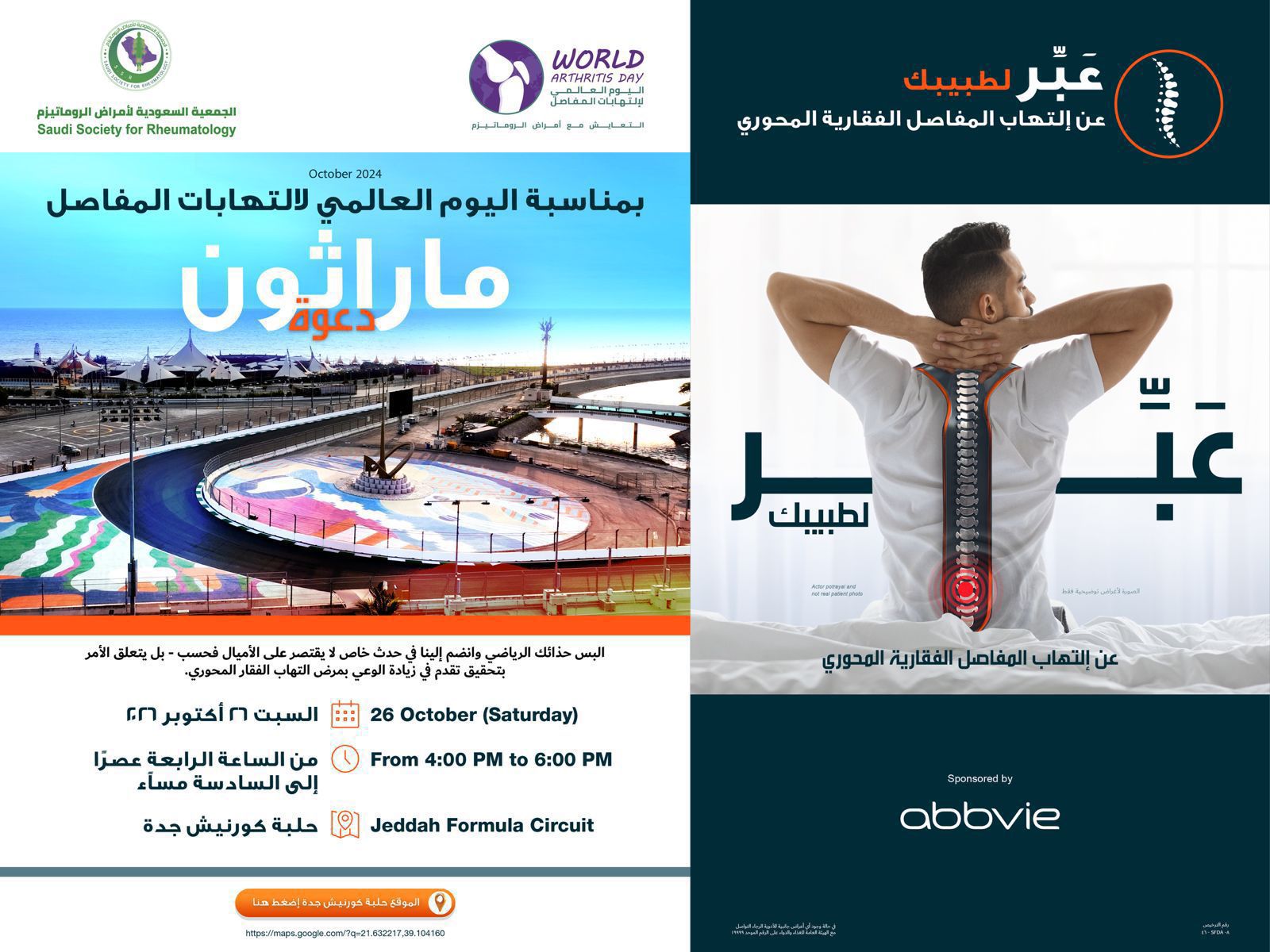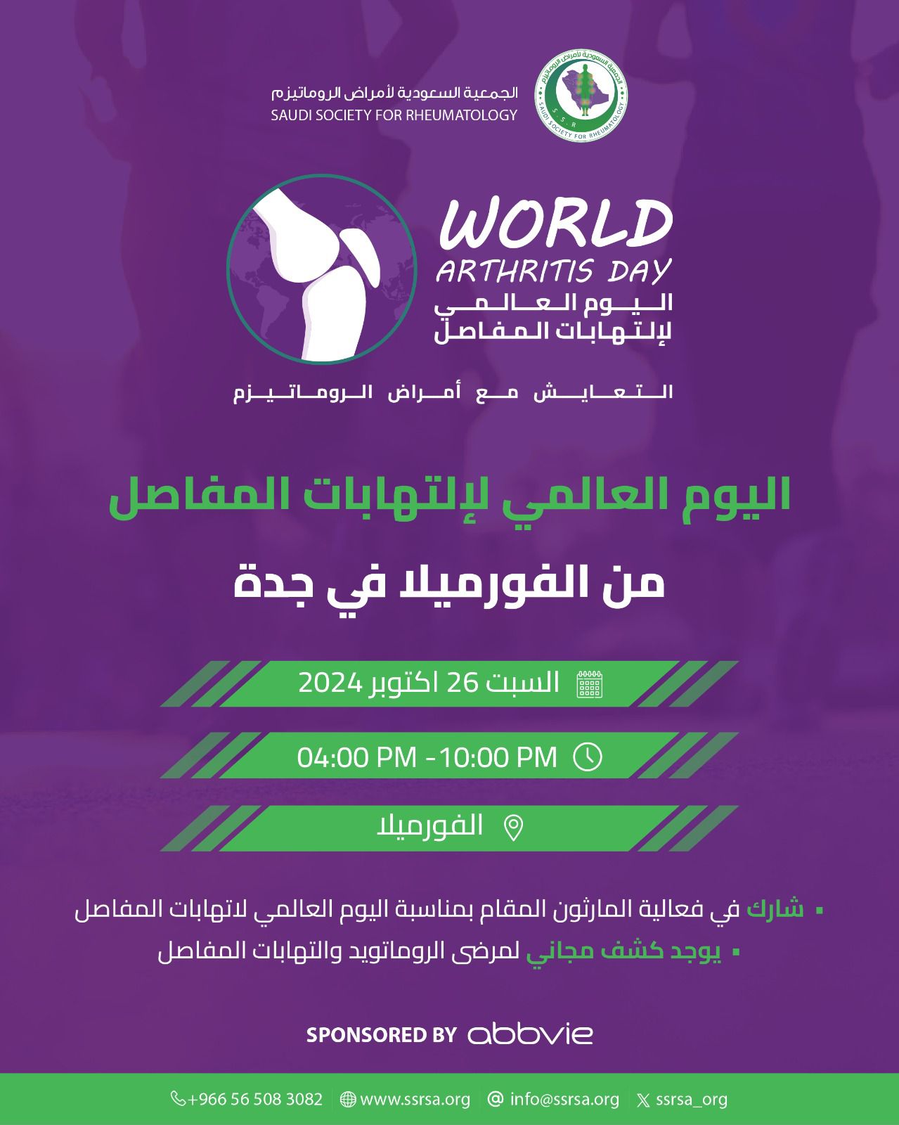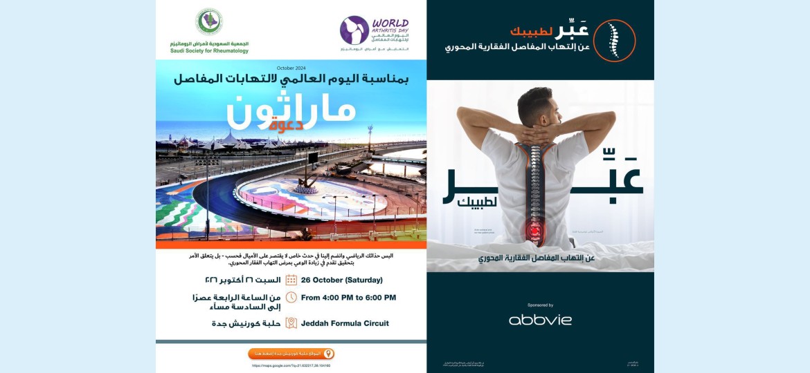 تنظم الجمعيةُ السعودية لأمراض الروماتيزم حملة التوعية" التعايش مع أمراض الروماتيزم "الفورميلا في حلبة كورنيش جدة يوم السبت 26 أكتوبر ٢٠٢٤م.