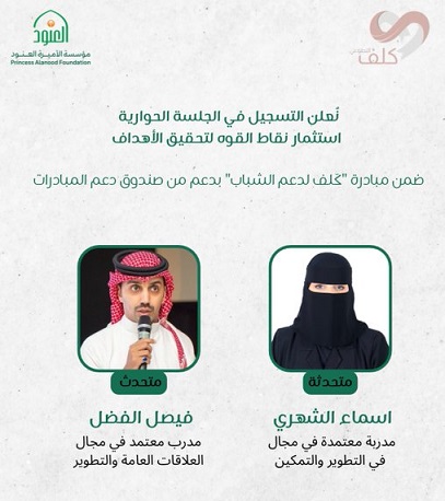 عبرت مستفيدات جمعية "كيان" للأيتام ذوي الظروف الخاصة عن شكرهن لجمعية كيان للأيتام التي أتاحت لهن الفرصة بحضور الجلسة الحوارية التي نظمها فريق كلف التطوعي ضمن مبادرة " كَلف لدعم الشباب" واحتضنتها مؤسسة الأميرة العنود الخيرية، وقدمها كل من المدربة أسماء الشهري والمدرب فيصل الفضل والتي كانت بعنوان " استثمار نقاط القوة لتحقيق الأهداف". والتي تهدف لمساعدة المتدربين والمتدربات على اكتشاف الذات وتعزيز مهاراتهم، وتعتبر فرصة رائعة للتطور الشخصي.