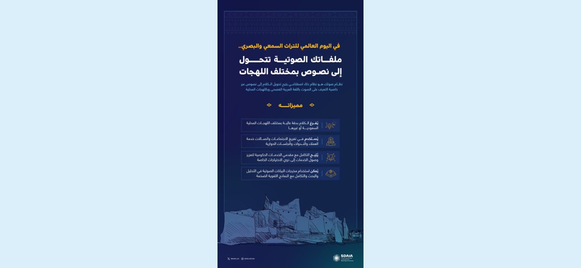 ومن المنتجات التقنية التي طورتها سدايا في مجال التراث السمعي والبصري تحويل الملفات الصوتية إلى نصوص باللهجات المحلية السعودية من خلال نظام (صوتك) الذي يتيح تحويل الكلام إلى نصوص دقيقة سواء باللغة العربية الفصحى أو باللهجات المحلية، معتمدًا على تقنيات التعرف على الصوت، ويُستخدم النظام في مجالات متعددة، مثل : تفريغ الاجتماعات والندوات، والجلسات الحوارية، وتحقيق التكامل مع خدمات ذوي الاحتياجات الخاصة لتسهيل وصولهم إلى المعلومات، حيث يعتمد “صوتك” على تقنيات متقدمة في التعرف على الصوت، مما يعزز كفاءة العمليات التي تعتمد على الصوت.