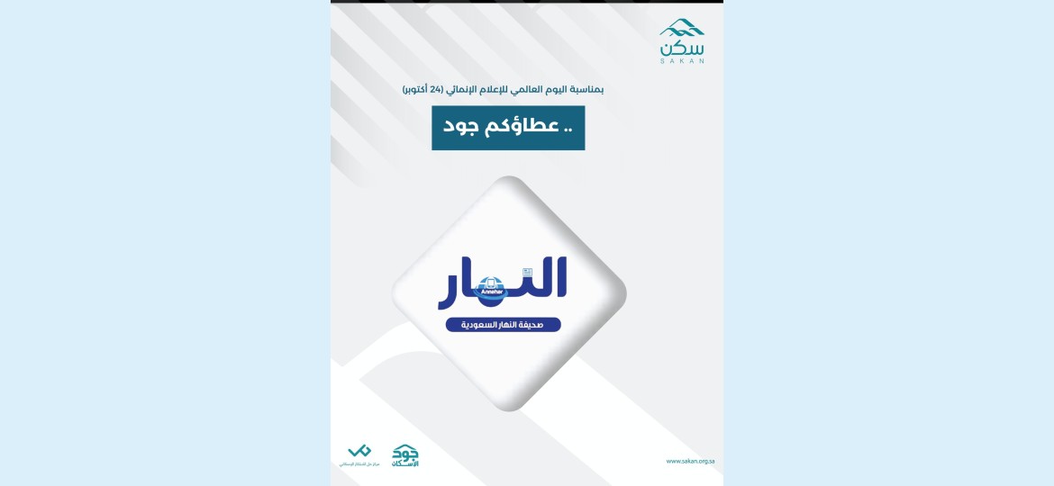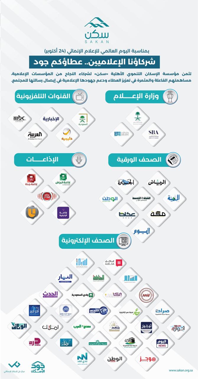 تقدمت مؤسسة سكن، بمناسبة اليوم العالمي للإعلام الإنمائي، بجزيل الشكر والعرفان لصحيفة النهار السعودية وعدد من الشركاء الآخرين من الكيانات الإعلامية الذين ساهموا في نشر رسائل العطاء والتحفيز.