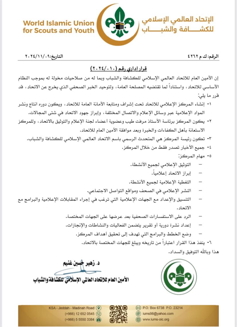 قرر الأمين العام للاتحاد العالمي الإسلامي للكشافة والشباب سعادة الدكتور زهير بن حسين غنيم بما له من صلاحيات تخوله بموجب النظام الأساسي للاتحاد ، واستناداً لما تقتضيه المصلحة العامة ولتوحيد الخبر الصحفي الذي يخرج عن الاتحاد قد تقرر إنشاء المركز الإعلامي للاتحاد تحت إشراف ومتابعة الأمانة العامة للاتحاد ، ويكون دوره إنتاج ونشر المواد الإعلامية عبر وسائل الإعلام والاتصال المختلفة، وإبراز جهود الاتحاد في شتىٰ المجالات.