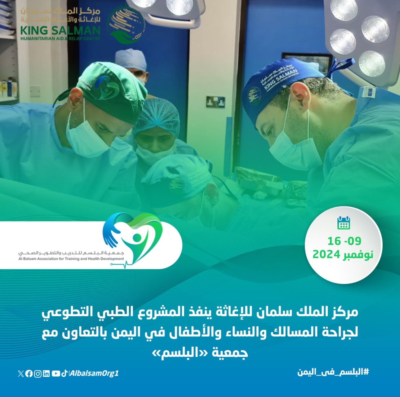 نفذ مركز الملك سلمان للإغاثة والأعمال الإنسانية، المشروع الطبي التطوعي لجراحة المسالك والنساء والأطفال في الجمهورية اليمنية، 56 عملية جراحية خلال أول يومين من البرنامج المنفذ في الفترة من 9 إلى 16 نوفمبر 2024م لعلاج المرضى من الأطفال والكبار في تخصصات مختلفة، من خلال جمعية «البلسم» للتدريب والتطوير الصحي.