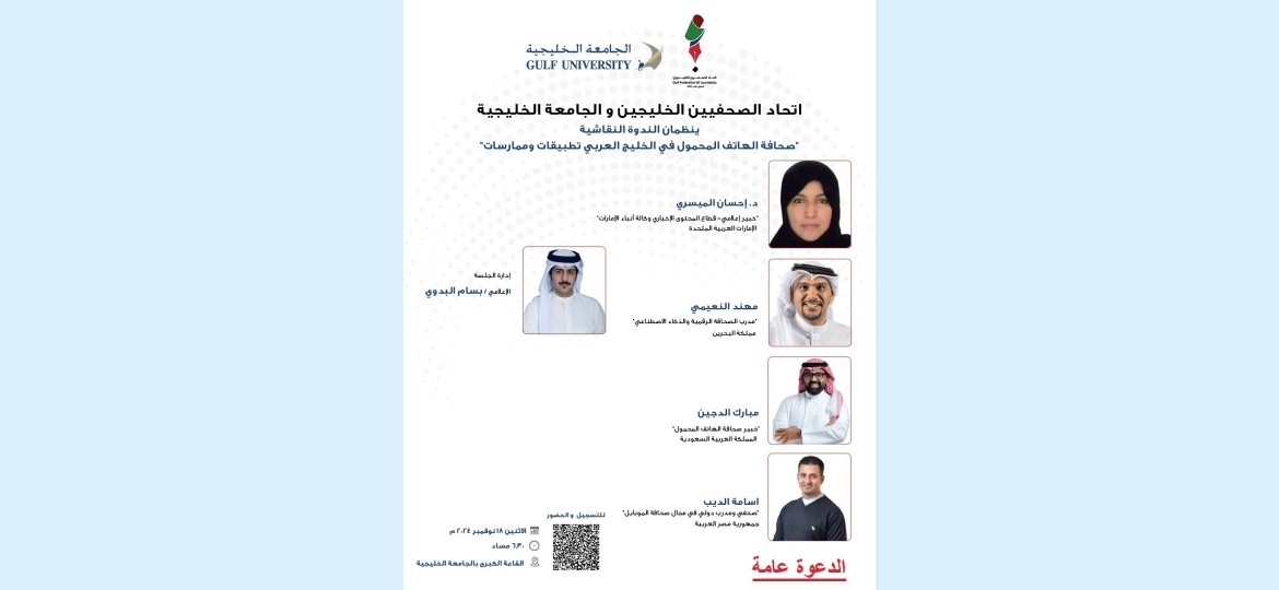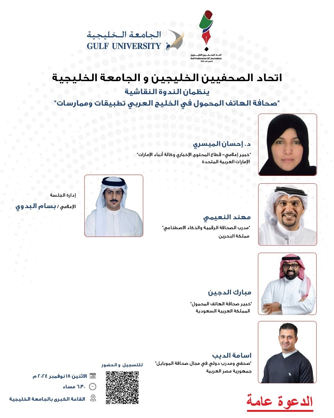 ينظم اتحاد الصحفيين الخليجيين بالتعاون مع الجامعة الخليجية ندوة نقاشية بعنوان “الهاتف المحمول في الخليج العربي: تطبيقات وممارسات”، بمشاركة عدد من المتحدثين من مملكة البحرين ودول مجلس التعاون لدول الخليج العربية.