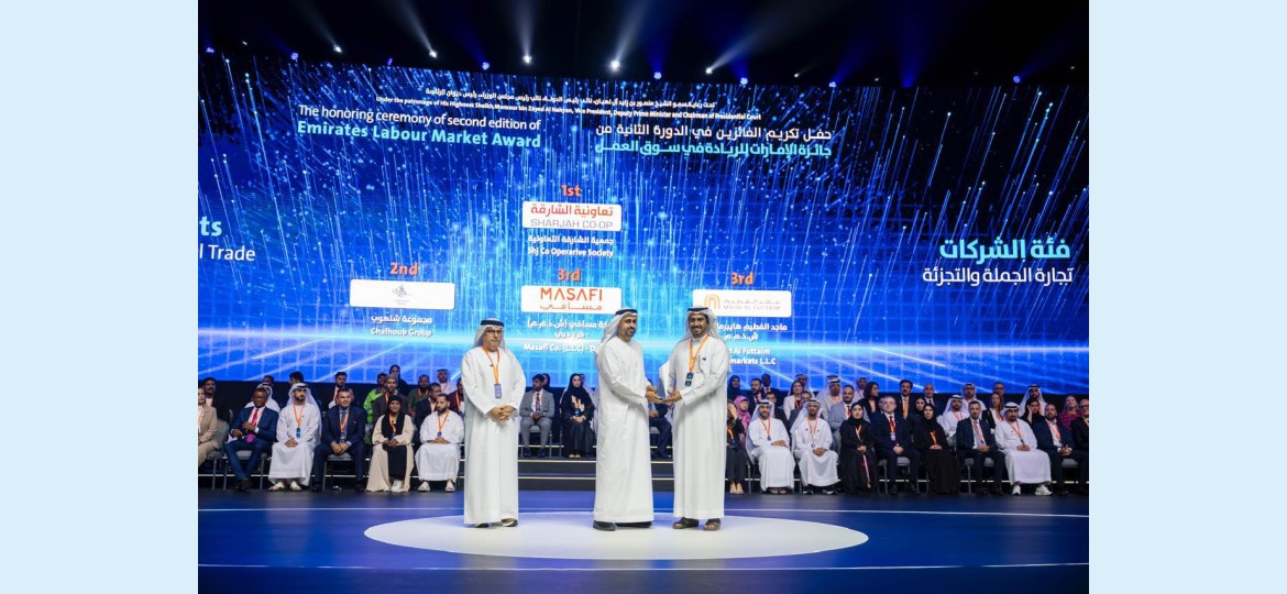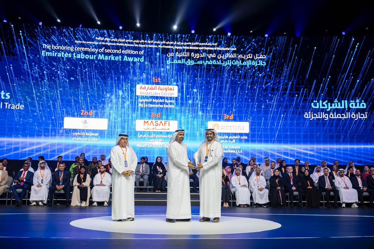 تحت رعاية سمو الشيخ منصور بن زايد آل نهيان، نائب رئيس الدولة، نائب رئيس مجلس الوزراء، رئيس ديوان الرئاسة، كرّم سمو الشيخ ذياب بن محمد بن زايد آل نهيان، نائب رئيس ديوان الرئاسة للشؤون التنموية وأسر الشهداء، رئيس مجلس الشؤون الإنسانية الدولية، ومعالي الدكتور عبد الرحمن العور، وزير الموارد البشرية والتوطين، تعاونية الشارقة بجائزة الإمارات للريادة في سوق العمل، في دورتها الثالثة حيث تسلم الجائزة عن سعادة الرئيس التنفيذي ماجد الجنيد، السيد هلال المحرم مدير إدارة الموارد البشرية في تعاونية الشارقة.