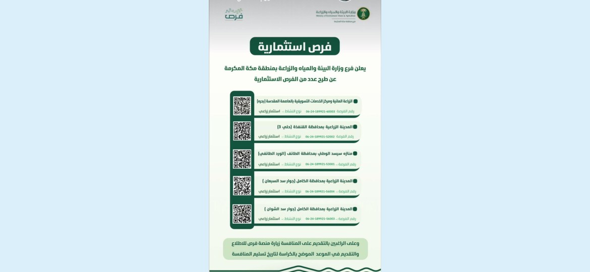 أعلن فرع وزارة البيئة والمياه والزراعة بمنطقة مكه المكرمه عن طرح خمس فرص استثمارية لمشاريع زراعية بمحافظات مختلفة بمنطقة مكة المكرمة بهدف إنتاج خضروات وفواكه عالية الجودة، ودعم عمليات ترشيد واستهلاك المياه في عمليات الري، وزيادة الاكتفاء الذاتي في المنتجات للمساهمة في تحقيق الأمن الغذائي بالمملكة وفق أهداف رؤية المملكة 2030.