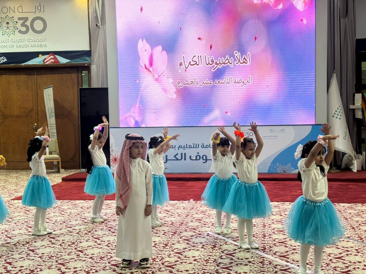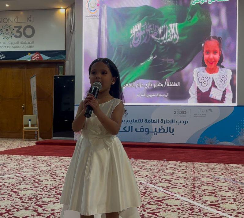 وقد استهل الحفل بآيات من القران الكريم تلا ذلك كلمة للمساعد للشؤون التعليمية للبنات أكدت فيها سعي حكومتنا الرشيدة في إتاحة وتوفير بيئة آمنة ومحفزة تضمن للطفل حق الرعاية والحماية والترفيه، وتمكينه من التمتع بطفولة سعيدة، مبينة أن رؤية المملكة 2030 أولت اهتمامًا بالغًا بمرحلة الطفولة من خلال تعزيز أوجه الرعاية التي تمكن الطفل من تنمية مهاراته وقدراته وترسيخ القيم الإيجابية لديه، بالإضافة إلى حق الطفل في التعليم كحق مركزي وشرط أساسي في تمكين الطفل،