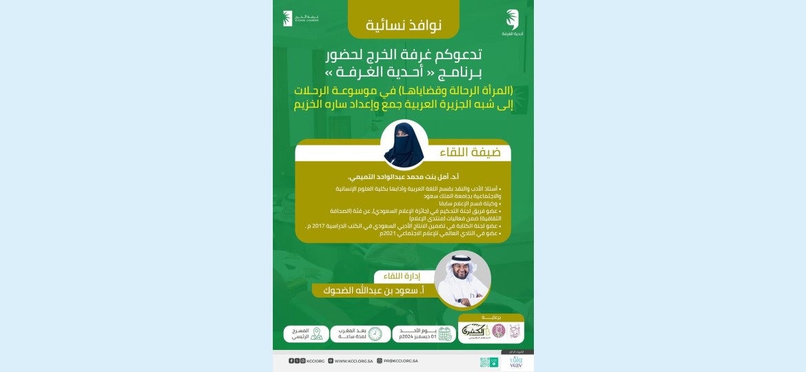 غداً، تُنظم غرفة الخرج لقاءً ثقافياً في المسرح بعد صلاة المغرب مباشرة، حيث تدعوكم لحضور محاضرة الدكتورة أمل التميمي بعنوان: "المرأة الرحالة وقضاياها"، وذلك في إطار موسوعة الرحلات إلى شبه الجزيرة العربية، جمع وإعداد الأستاذة سارة الخزيم.
