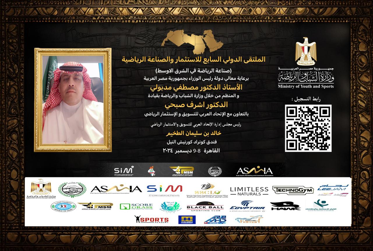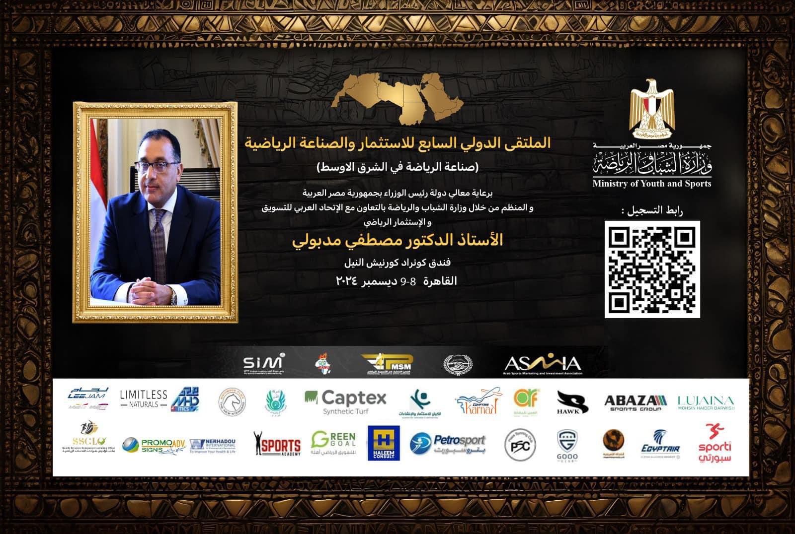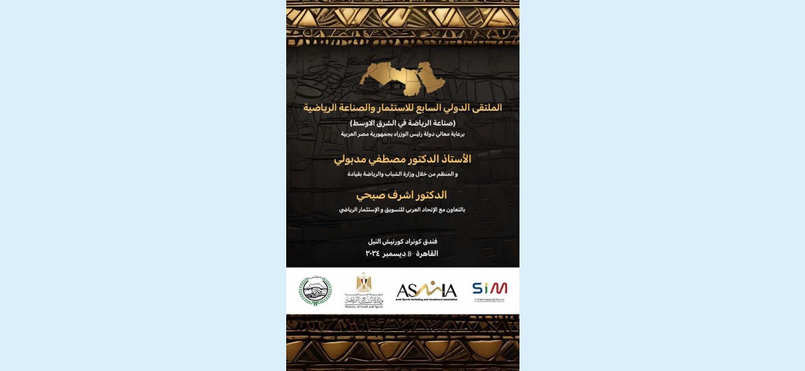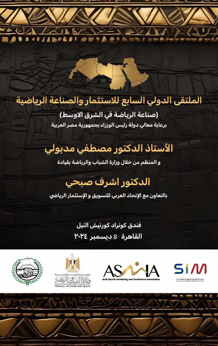 فى اطار الاستعداد لاستضافة مصر للنسخة السابعة من الملتقى الدولي للاستثمار والصناعة الرياضية ولأول مرة يكون هذا الحدث برعاية دولة رئيس مجلس وزراء مصر الأستاذ الدكتور مصطفى مدبولي حيث ينظمة الاتحاد العربي للتسويق والاستثمار الرياضى للعام السابع على التوالى بالتعاون مع وزارة الشباب والرياضة المصرية بمشاركة عشرات الشركات والكيانات والمؤسسات والمصانع العالمية والعربية والمصرية المتخصصة فى مجال الصناعة والتصنيع والتسويق والترويج والاستثمار الرياضى