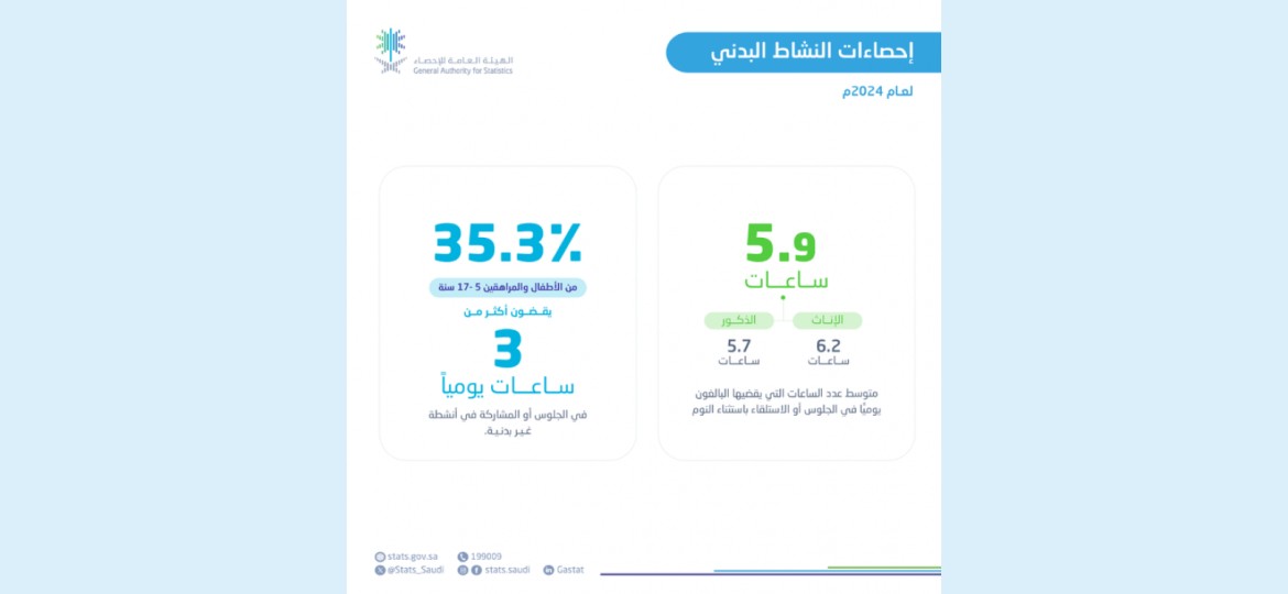 وأظهرت نتائج النشرة أن نسبة الأفراد الذين تتجاوز أعمارهم 18 عامًا الممارسين للنشاط البدني لمدة 150 دقيقة أو أكثر أسبوعيًا بلغت 58.5 % على مستوى المملكة، فيما بلغت نسبة الأطفال والمراهقين في الفئة العمرية من 5 إلى 17 سنة الممارسين للنشاط البدني لمدة 60 دقيقة أو أكثر يوميًا 18.7% .