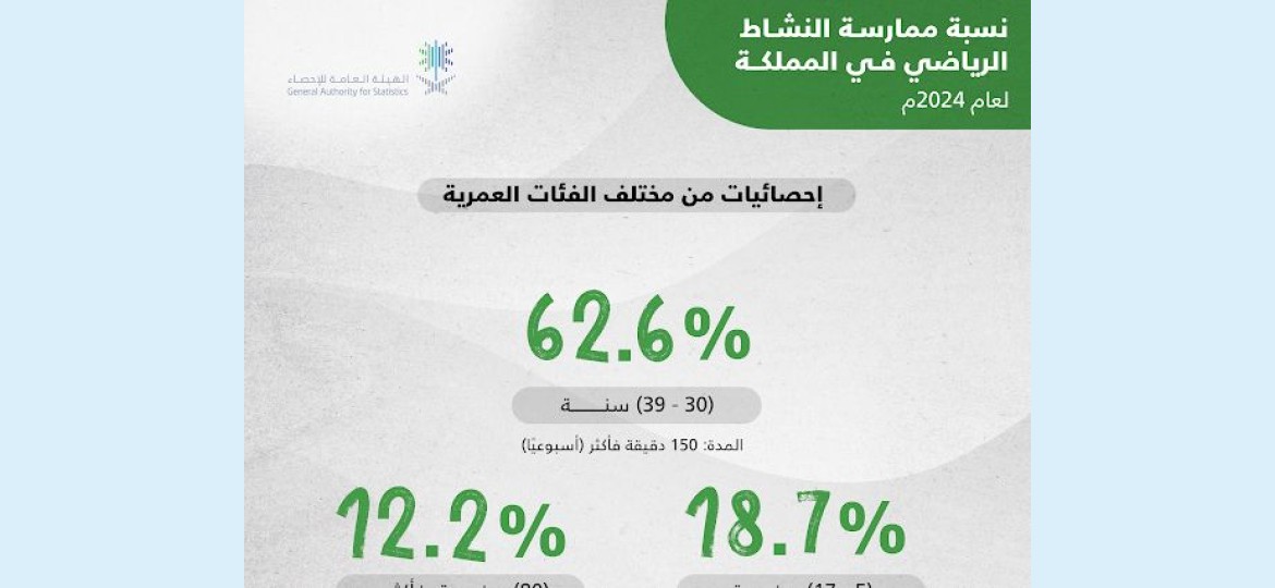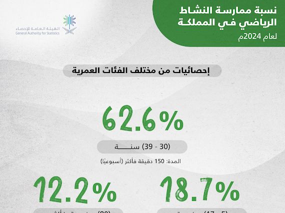 وأظهرت نتائج النشرة أن نسبة الأفراد الذين تتجاوز أعمارهم 18 عامًا الممارسين للنشاط البدني لمدة 150 دقيقة أو أكثر أسبوعيًا بلغت 58.5 % على مستوى المملكة، فيما بلغت نسبة الأطفال والمراهقين في الفئة العمرية من 5 إلى 17 سنة الممارسين للنشاط البدني لمدة 60 دقيقة أو أكثر يوميًا 18.7%.
