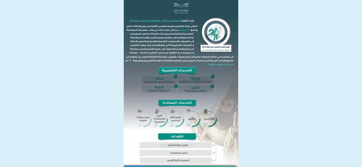 تزامنًا مع اليوم العالمي للأشخاص ذوي الإعاقة الذي يوافق 3 ديسمبر من كل عام، تحتفل وزارة التعليم هذا العام 2024 بالشعار المميز “التمكين من أجل مستقبل شامل ومستدام”. تهدف هذه الاحتفالية إلى تعزيز جهود الوزارة في تقديم خدمات تعليمية متكاملة ومتميزة لذوي الإعاقة، مع التركيز على إدماجهم في البيئة المدرسية وتعزيز فرص التعليم للجميع.