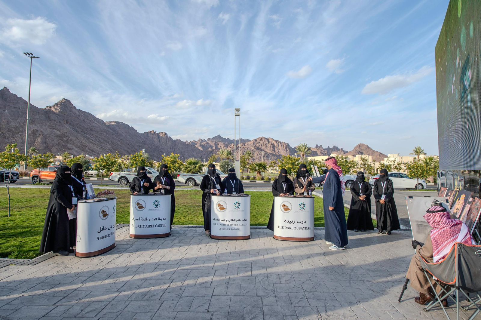وقد عرّف الطالبات في الأركان التعريفية بدرب زبيدة ومدينة فيد التاريخية وقلعة عيرف وموقدة حاتم الطائي ، فيما أُتيحت الفرصة للزوار من أجل تجربة كتابة اسمائهم باللغة الثمودية المنتشرة في جبال حائل .