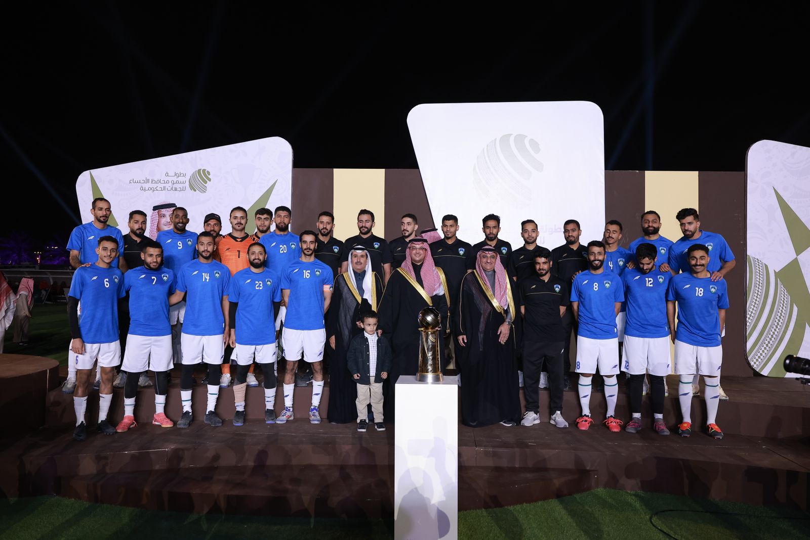 توّج صاحب السمو الملكي الأمير سعود بن طلال بن بدر محافظ الأحساء ، مساء أمس " الثلاثاء " ، فريق شرطة محافظة الأحساء الفائز في الموسم الثاني من بطولة سموّه للقطاعات الحكومية لكرة القدم، التي نظّمتها أمانة الأحساء تحت شعار “وطن بلا مخدرات”، وشارك فيها 28 فريقاً من مختلف القطاعات، وأقيمت منافساتها في على ملعب متنزه الملك عبدالله البيئي.