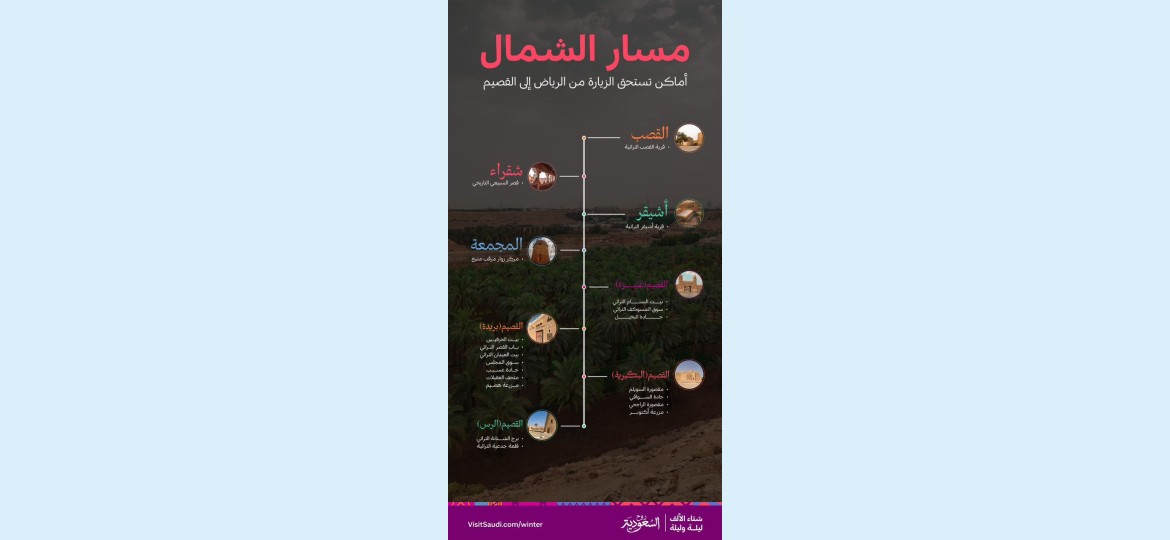 ويأتي إعلان الهيئة السعودية للسياحة عن مسار الشمال؛ في إطار تسليط الأضواء على الوجهات والمواقع والمعالم المميزة والتي تزخر بها المملكة العربية السعودية، والتي تضفي بعداً سياحياً وترفيهياً على الرحلة البرية التي تلبي تطلعات جميع أفراد العائلة، إضافةً للأفراد والمجموعات من داخل المملكة وخارجها؛ أثناء التنقل بين منطقتي الرياض والقصيم.