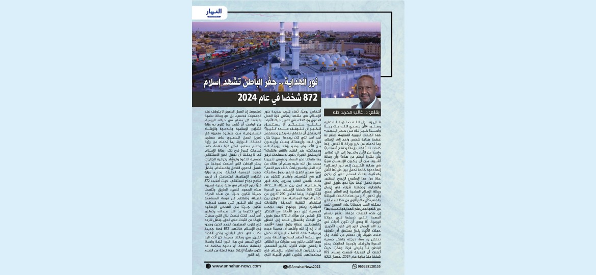 كما لا يمكننا أن نغفل الدور الاستثنائي لجمعية الدعوة والإرشاد وتوعية الجاليات بحفر الباطن، التي أصبحت نموذجًا حيًا للعمل الدعوي الفعال والمستدام. بفضل جهود الجمعية الحثيثة، ودعم وزارة الشؤون الإسلامية، استطاعت أن ترسم ملامح نجاح استثنائي، حيث أضاءت 872 قلبًا بنور الإسلام في فترة زمنية قصيرة.