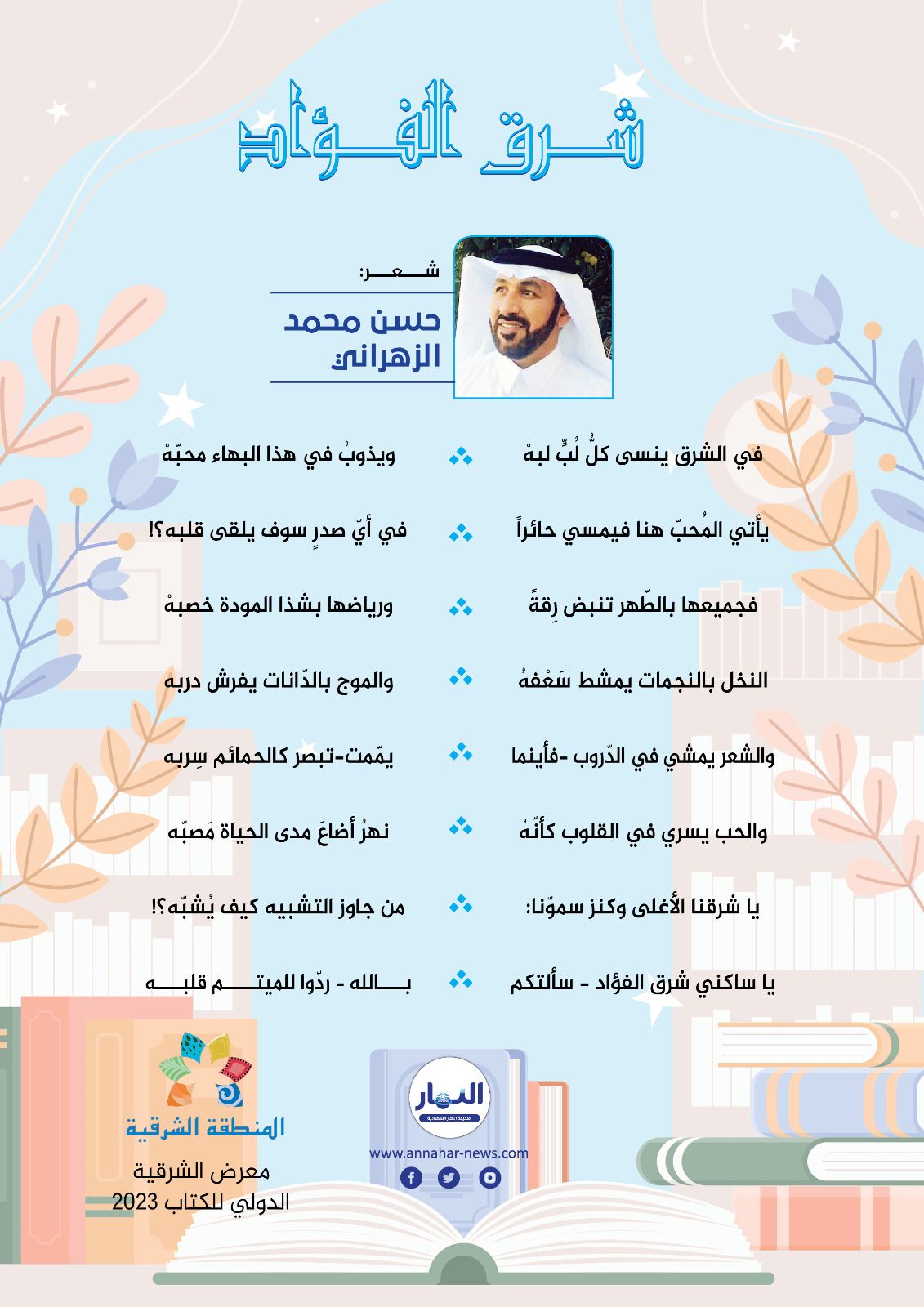 عندما يحدثك شاعر في مقام وقيمة شاعرنا القدير حسن بن محمد الزهراني عن رحلته وهو متجه لمنطقة غالية من بلادنا الحبيبة (المنطقة الشرقية) ليشارك في فعاليات معرض المنطقة الشرقية للكتاب 2023، تأتي الكلمات كنسيم منطقة الباحة المعطر برياحين وزهور جبالها وأوديتها المزدانة بجمال طبيعتها الخلابة، حيث تطرب الآذان لعزف شلالاتها وانسياب مياه أوديتها العذبة فيأتي الحديث أبياتا معبرة عن مكان وجهته المنطقة الشرقية ويخص صحيفة النهار بنشرها كما قال (هذه القصيدة لم تنشركتبتها بمحبة) تحت عنوان (شرق الفؤاد)