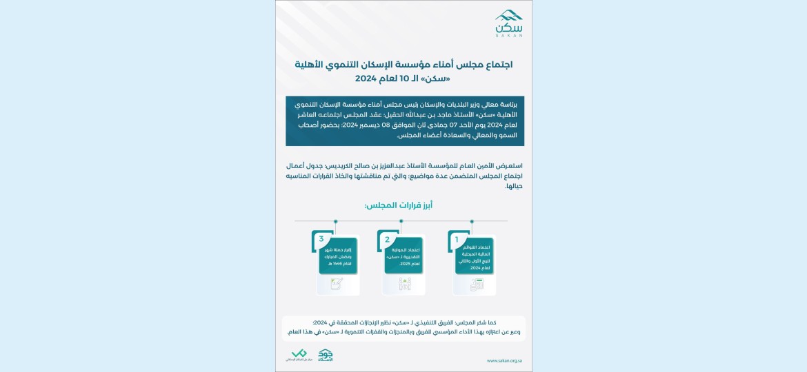 كما عبر المجلس؛ عن شكره للفريق التنفيذي لـ "سكن"؛ نظير الإنجازات المحققة في 2024؛ واعتزاز الأعضاء بهذا الأداء المؤسسي للفريق وبالمنجزات والقفزات التنموية لـ "سكن" في هذا العام.