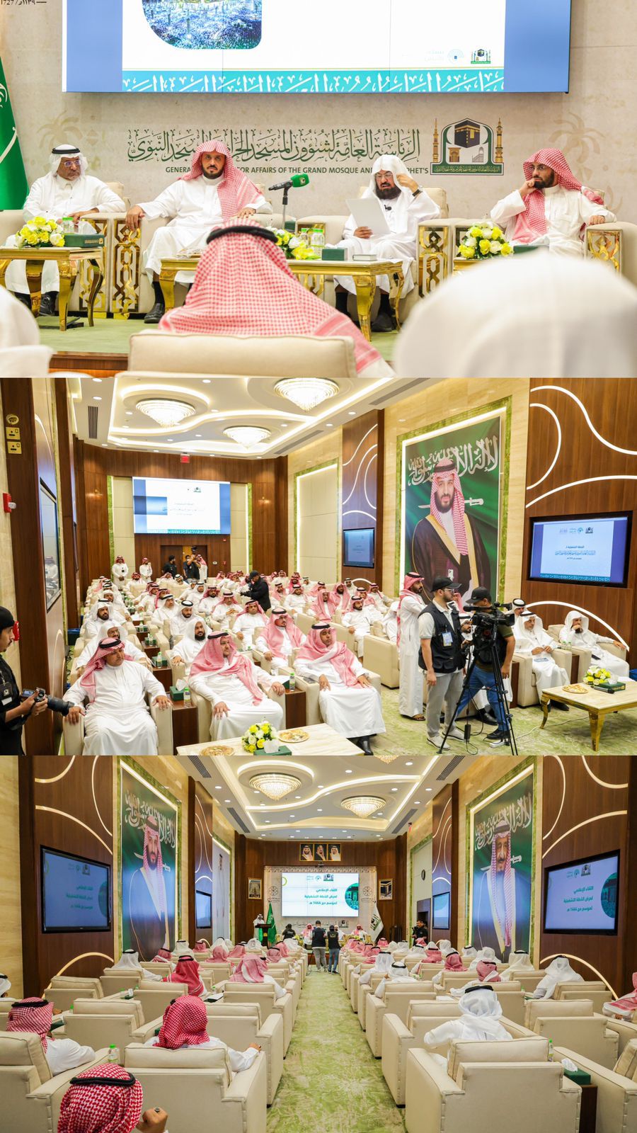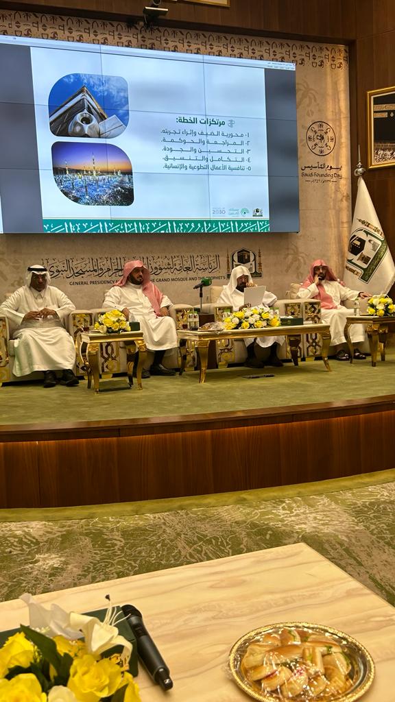 وأردف معاليه قائلا" إن الخطة انطلقت من أهداف الرئاسة الاستراتيجية المنطلقة من رؤية ٢٠٣٠ المباركة والتي تعنى بتمكين القاصدين وتهيئة البيئة الإيمانية الخاشعة والآمنة والصحية لهم فضلا عن الحرص على انسيابية الحركة وتدفق الحشود من وإلى الحرمين الشريفين وإعطاء الأولوية لرقمته لخدماتها، وإدخال التقنيات الحديثة والتطبيقات الذكية والروبوتات الآلية والمنصات الإلكترونية... وأعلن الرئيس العام أن خطة موسم الحج أكثر من ٢٠٠ برنامج ومشاركة أكثر من ١٤ ألف موظف من الرئاسة وتكريس مفهوم العمل الميداني على مدار الساعة... وثمن معالي جهود القيادة الرشيدة حفظها الله في إعمار ورعاية الحرمين الشريفين والمشاعر المقدسة وخدمة قاصديهما في تستهدف كافة المسلمين في أرجاء المعمورة. وأكد على أهمية تعظيم رسالةالحرمين الشريفين الوسطية في العالم وتسليط الضوء على جهود المملكة في خدمة الحرمين الشريفين والحجاج والتأكيد على ثوابت المملكة في رسالتها لخدمة الحرمين الشريفين التي تتمحور في حسن الوفادةللقاصدين ونشر الهداية للعالمين، وتمكين القاصدين من أداء العبادة على بصيرة في بيئة آمنة طاهرةمثرية وصحية وتحقيق رسالة الحرمين الشريفين الدعوية والعلمية
