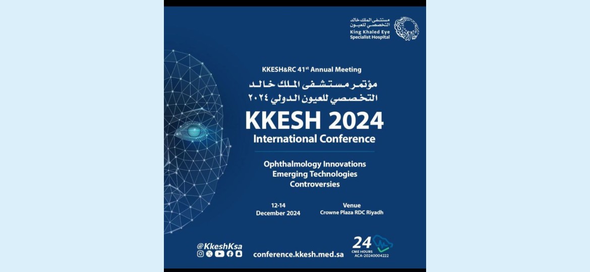 تنطلق قريباً فعاليات مؤتمر مستشفى الملك خالد التخصصي للعيون ومركز الأبحاث في فندق كراون بلازا -النخيل الرياض خلال الفترة من ١٢ الى ١٤ ديسمبر ٢٠٢٤ بحضور الرئيس التنفيذي لمستشفى الملك خالد التخصصي للعيون د.عبد العزيز الراجحي.