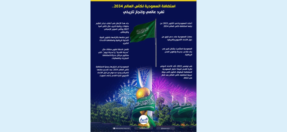 السعودية تم اختيارها رسميًا لاستضافة كأس العالم 2034، بعد تقديم ملفها كمرشح وحيد مدعوم من قبل الاتحاد الآسيوي لكرة القدم بأعلى تصويت.
