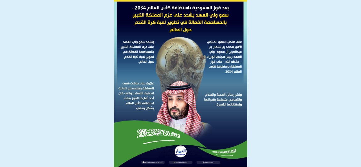 أكد صاحب السمو الملكي الأمير محمد بن سلمان بن عبدالعزيز آل سعود، ولي العهد رئيس مجلس الوزراء - حفظه الله - على فوز المملكة باستضافة كأس العالم 2034.
