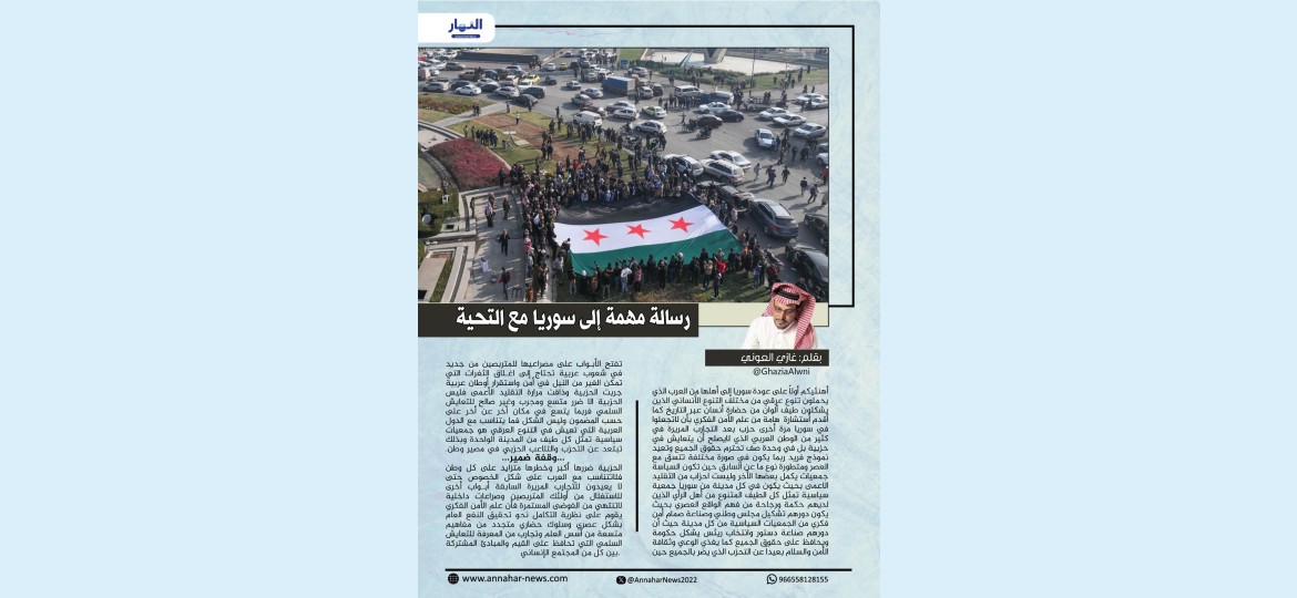أهنئيكم أولاً على عودة سوريا إلى أهلها من العرب الذي يحملون تنوع عرقي من مختلف التنوع الأنساني الذين يشكلون طيف ألوان من حضارة أنسان عبر التاريخ كما أقدم أستشارة هامة من علم الأمن الفكري بأن لاتجعلوا في سوريا مرة أخرى حزب بعد التجارب المريرة في كثير من الوطن العربي الذي لايصلح أن يتعايش في حزبية بل في وحدة صف تحترم حقوق الجميع وتعيد نموذج فريد ربما يكون في صورة مختلفة تتسق مع العصر ومتطورة نوع ما عن السابق حين تكون السياسة جمعيات يكمل بعضها الأخر وليست احزاب من التقليد الاعمى بحيث يكون في كل مدينة من سوريا جمعية سياسية تمثل كل الطيف المتنوع من اهل الرأي الذين لديهم حكمة ورجاحة من فهم الواقع العصري بحيث يكون دورهم تشكيل مجلس وطني وصناعة صمام أمن فكري من الجمعيات السياسية من كل مدينة حيث أن دورهم صناعة دستور وانتخاب ريئس يشكل حكومة ويحافظ على حقوق الجميع كما يغذي الوعي وثقافة الأمن والسلام بعيداً عن التحزب الذي يضر بالجميع حين تفتح الأبواب على مصراعيها للمتربصين من جديد في شعوب عربية تحتاج إلى اغلاق الثغرات التي تمكن الغير من النيل في أمن واستقرار أوطان عربية جربت الحزبية وذاقت مرارة التقليد الأعمى فليس الحزبية الا ضرر متسع ومجرب وغير صالح للتعايش السلمي فربما يتسع في مكان أخر عن أخر على حسب المضمون وليس الشكل فما يتناسب مع الدول العربية التي تعيش في التنوع العرقي هو جمعيات سياسية تمثل كل طيف من المدينة الواحدة وبذلك تبتعد عن التحزب والتلاعب الحزبي في مصير وطن.