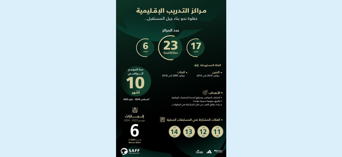 يذكر أن مراكز التدريب الإقليمية والبالغ عددها 23 مركزًا، تضم 17 مركزًا للبنين تستهدف المواليد من 2010 إلى 2014 و6 مراكز للبنات تستهدف المواليد من 2009 إلى 2018، وهو ما يعكس اهتمام المراكز باكتشاف المواهب على مستوى الفتيات ليكنّ نواة للمنتخب الوطني للسيدات خلال السنوات القادمة ضمن استراتيجية تطوير كرة القدم النسائية في المملكة والتي حققت تقدمًا لافتًا في الفترة الأخيرة.