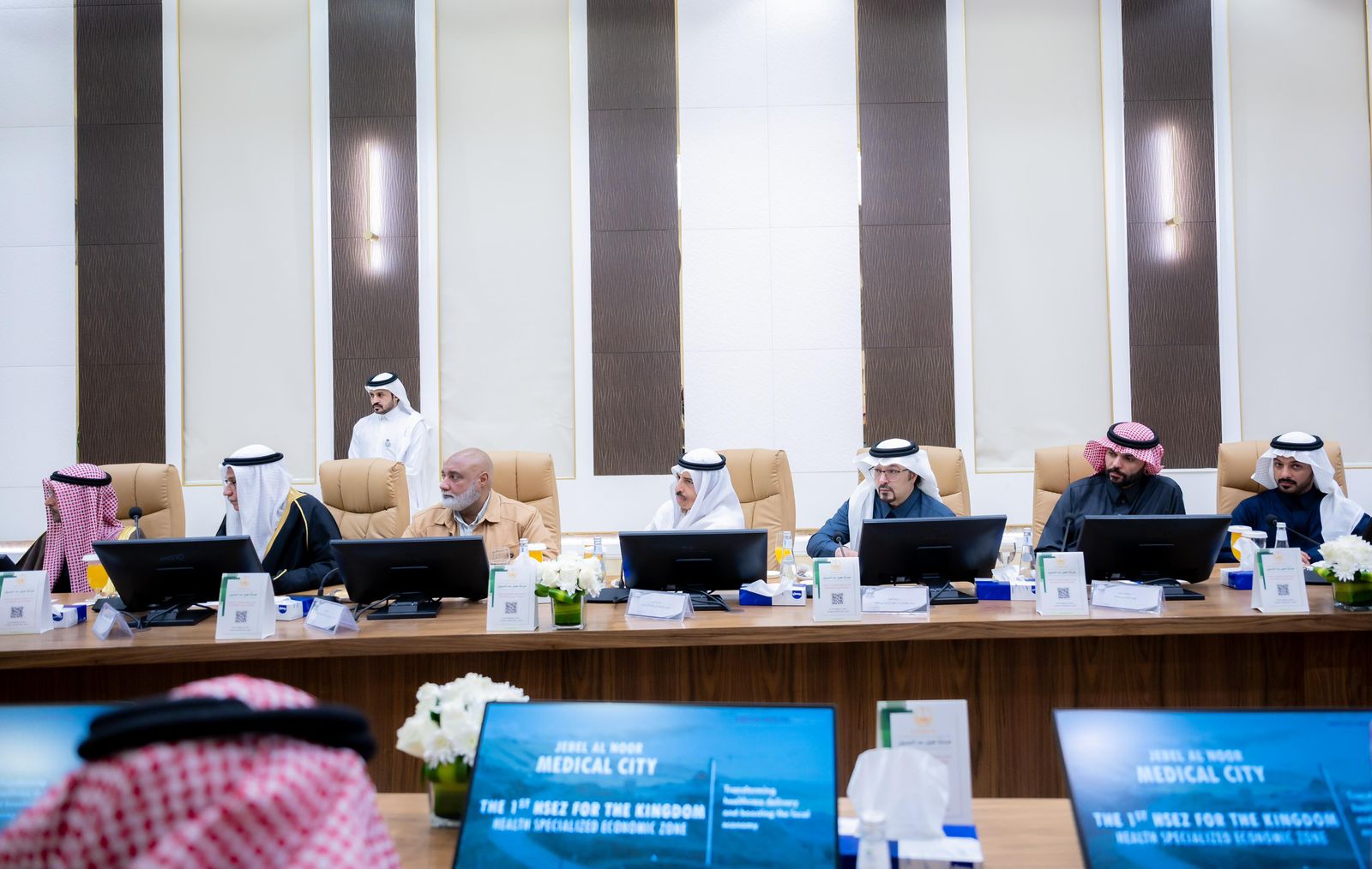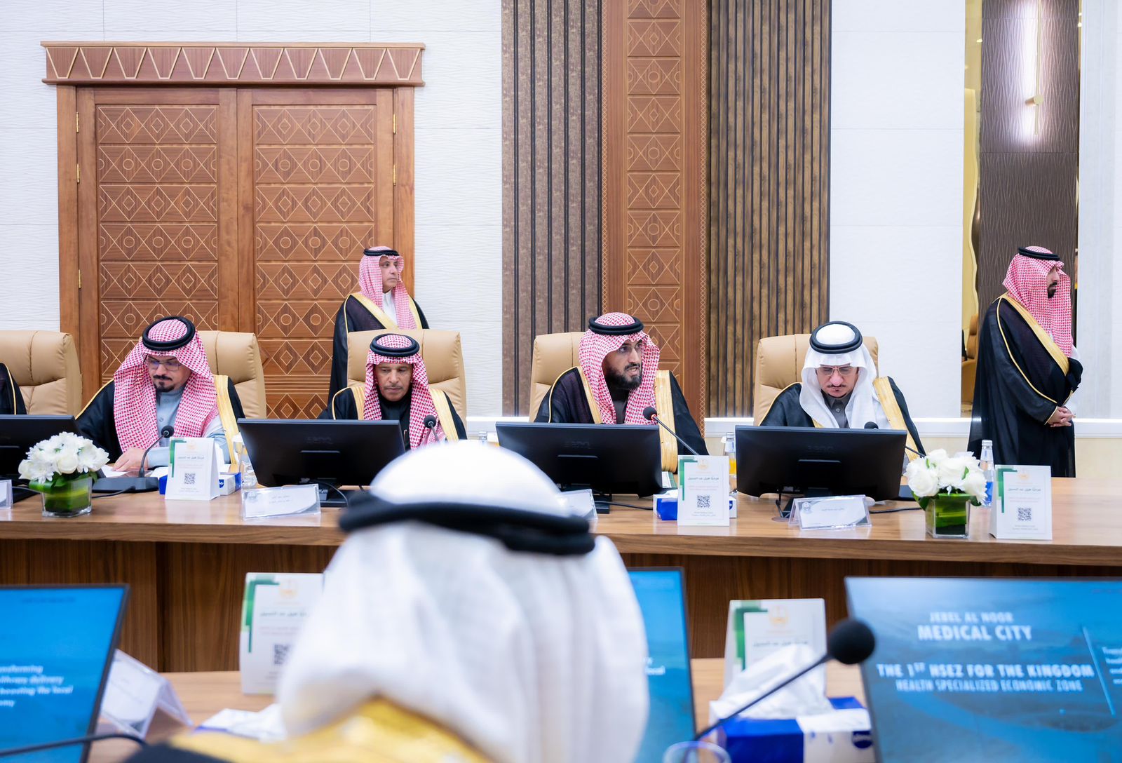 ناقش صاحب السمو الملكي الأمير الدكتور حسام بن سعود بن عبدالعزيز أمير منطقة الباحة رئيس اللجنة الإشرافية للمكتب الإستراتيجي لتطوير المنطقة، مشروع "جبل النور المدينة الطبية الجامعية"، وذلك خلال اجتماع سموه، مع معالي الدكتور نايف الحجرف وفريق عمله من شركة فيرتس هيلث بارتنرز المالكة لمشروع «جبل النور المدينة الطبية الجامعية»، بحضور فريق من وزارة الاستثمار يترأسهم مساعد وكيل وزارة الاستثمار لقطاع الصحة الدكتور مبارك الملحم، وأعضاء اللجنة العليا بالمنطقة المكونة من قيادات الجهات الحكومية بالمنطقة، وذلك بقاعة الاجتماعات بمكتب سموه.