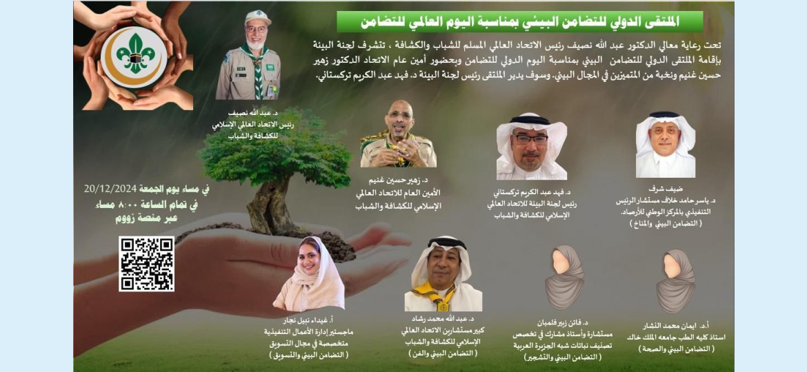 بمناسبة اليوم العالمي للتضامن ، تنظم اللجنة البيئية للاتحاد العالمي الإسلامي للكشافة والشباب الملتقى الدولي للتضامن البيئي عن بعد عبر منصة الزووم برعاية معالي الدكتور عبدالله نصيف رئيس الاتحاد العالمي المسلم للشباب والكشافة، وبحضور أمين عام الاتحاد سعادة الدكتور زهير بن حسين غنيم ونخبة من المتميزين في المجال البيئي وذلك في مساء الجمعة 20/12/2024م الساعة 8:00 مساء بتوقيت مكة المكرمة.