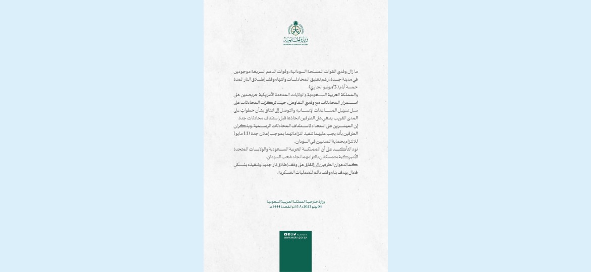 بيان | المملكة العربية السعودية والولايات المتحدة الأمريكية تؤكدان حرصهما على استمرار المحادثات مع وفدي التفاوض السوداني