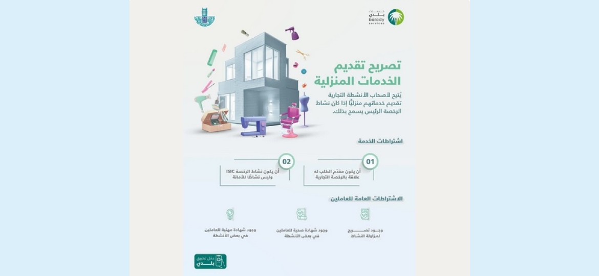 وأوضحت أن تصريح تقديم الخدمات المنزلية يمكن الاستفادة منه في بعض أنواع الأنشطة التجارية منها: الصالونات الرجالية، والتزيين النسائي، والخياطة الرجالية أو النسائية، وتقديم خدمات الاسترخاء والعناية الشخصية الرجالية أو النسائية، بشرط وجود رخصة محل سارية، وأن يكون مقدّم الطلب له علاقة بالرخصة التجارية، مع أهمية أن يكون نشاط الرخصة ISIC، وليس نشاطًا للأمانة، بالإضافة إلى تحقيق الاشتراطات الخاصة بالعاملين، وهي وجود تصريح لمزاولة النشاط، وشهادة صحية، وشهادة مهنية لبعض الأنشطة، فإذا كان نوع النشاط الرئيس خاصًّا برخصة (الصالونات النسائية) فيلزم إرفاق شهادة صحية، وشهادة مهنية؛ للممارسة ويجب أن تكون أُنثى، أما إذا كان نوع النشاط الرئيس خاصًّا برخصة (الصالونات الرجالية) فيلزم إرفاق شهادة صحية.
