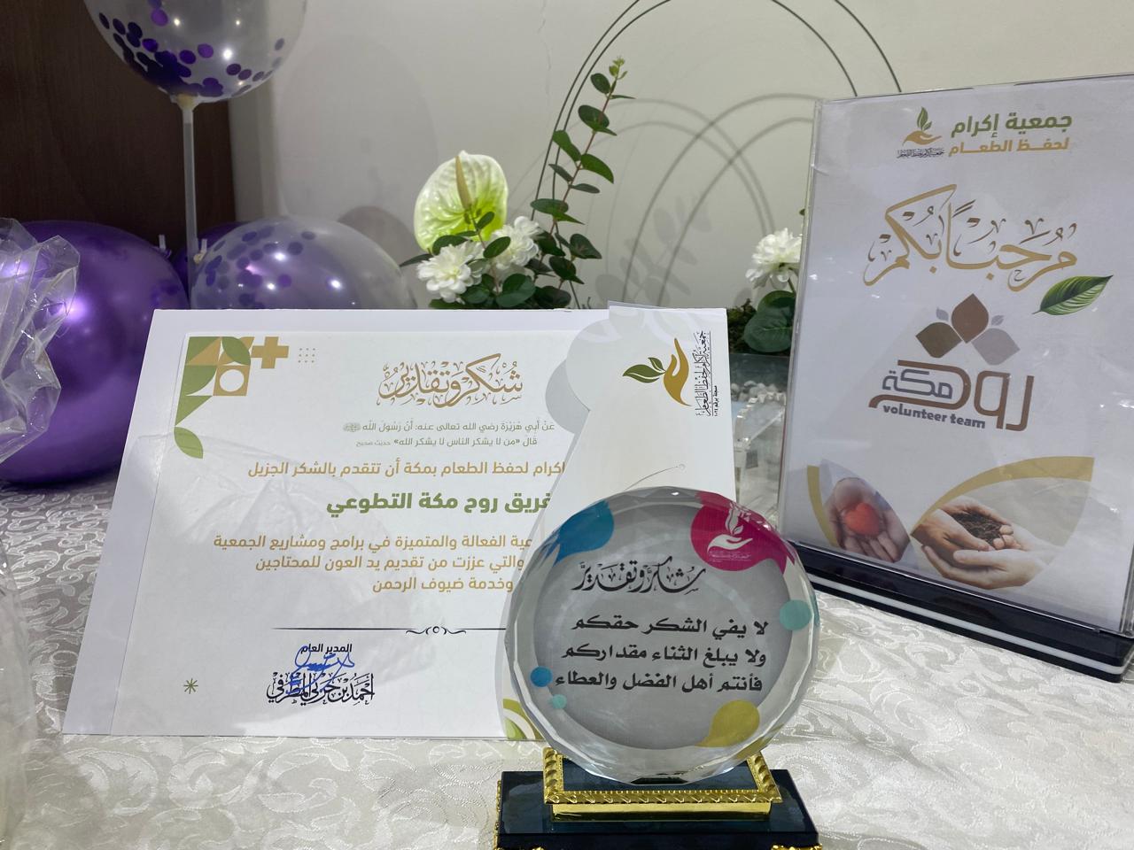 كرّمت جمعية إكرام لحفظ الطعام اليوم الاثنين 22 جمادى الآخرة 1446هـ فريق روح مكة التطوعي لمساهمتهم الفاعلة في مبادرة تغليف أكياس الطعام، وذلك خلال حفل أُقيم بمقر الجمعية. وقد قدمت قائدة وحدة التطوع، الأستاذة صباح الهذلي، شهادات شكر وتقدير لأعضاء الفريق، تقديرًا لجهودهم البارزة في دعم العمل الخيري وتعزيز قيم التطوع في المجتمع.