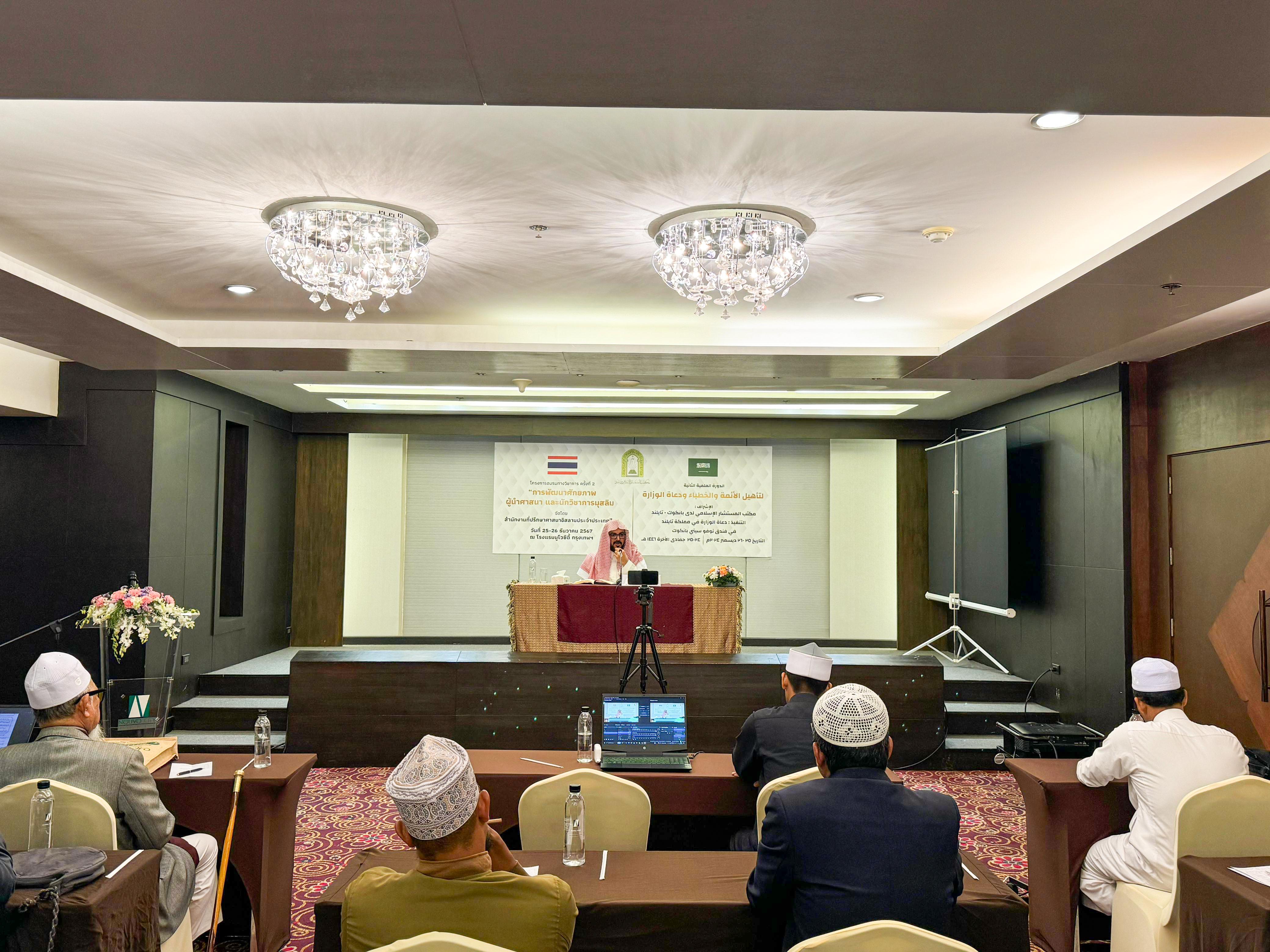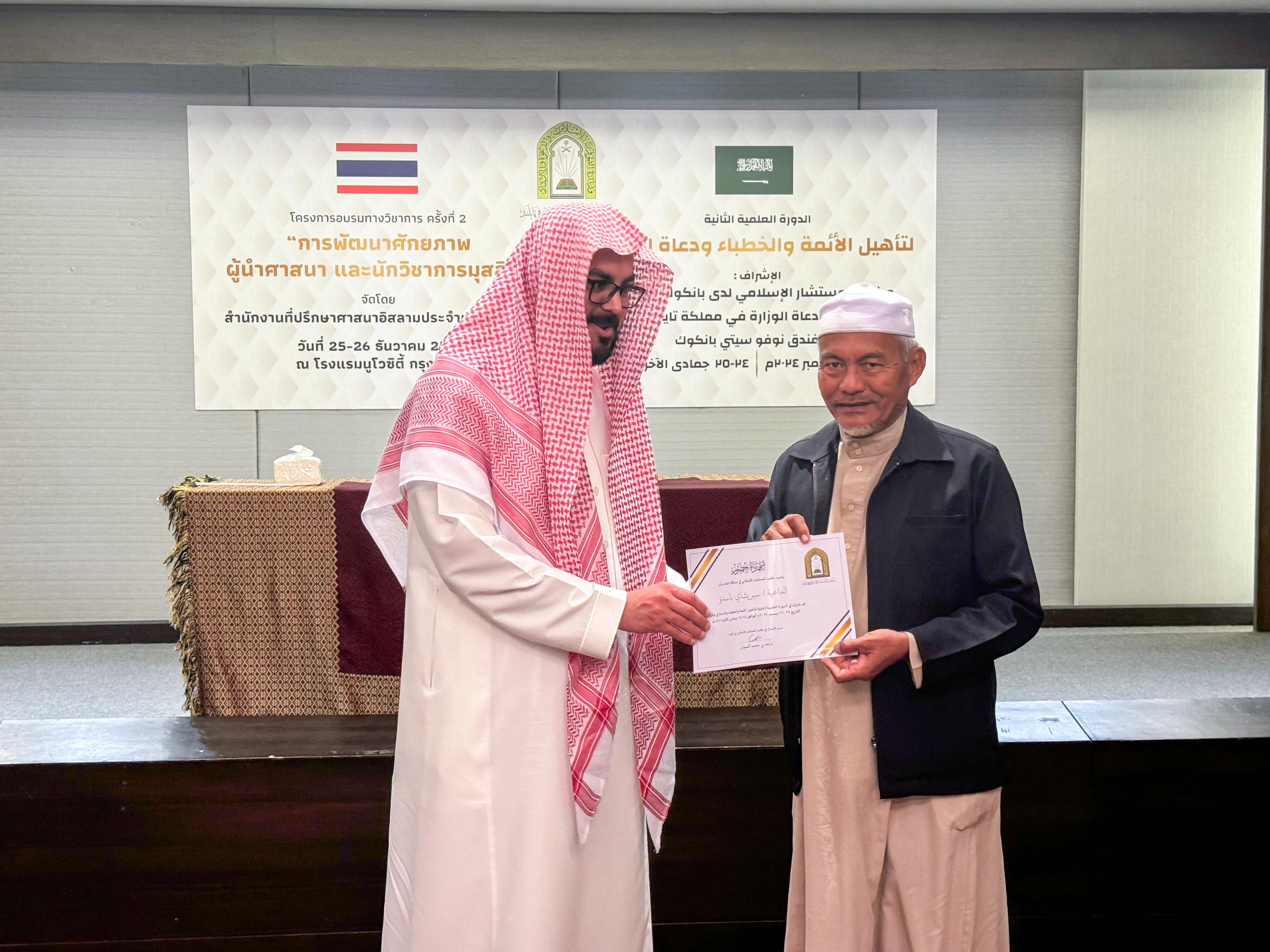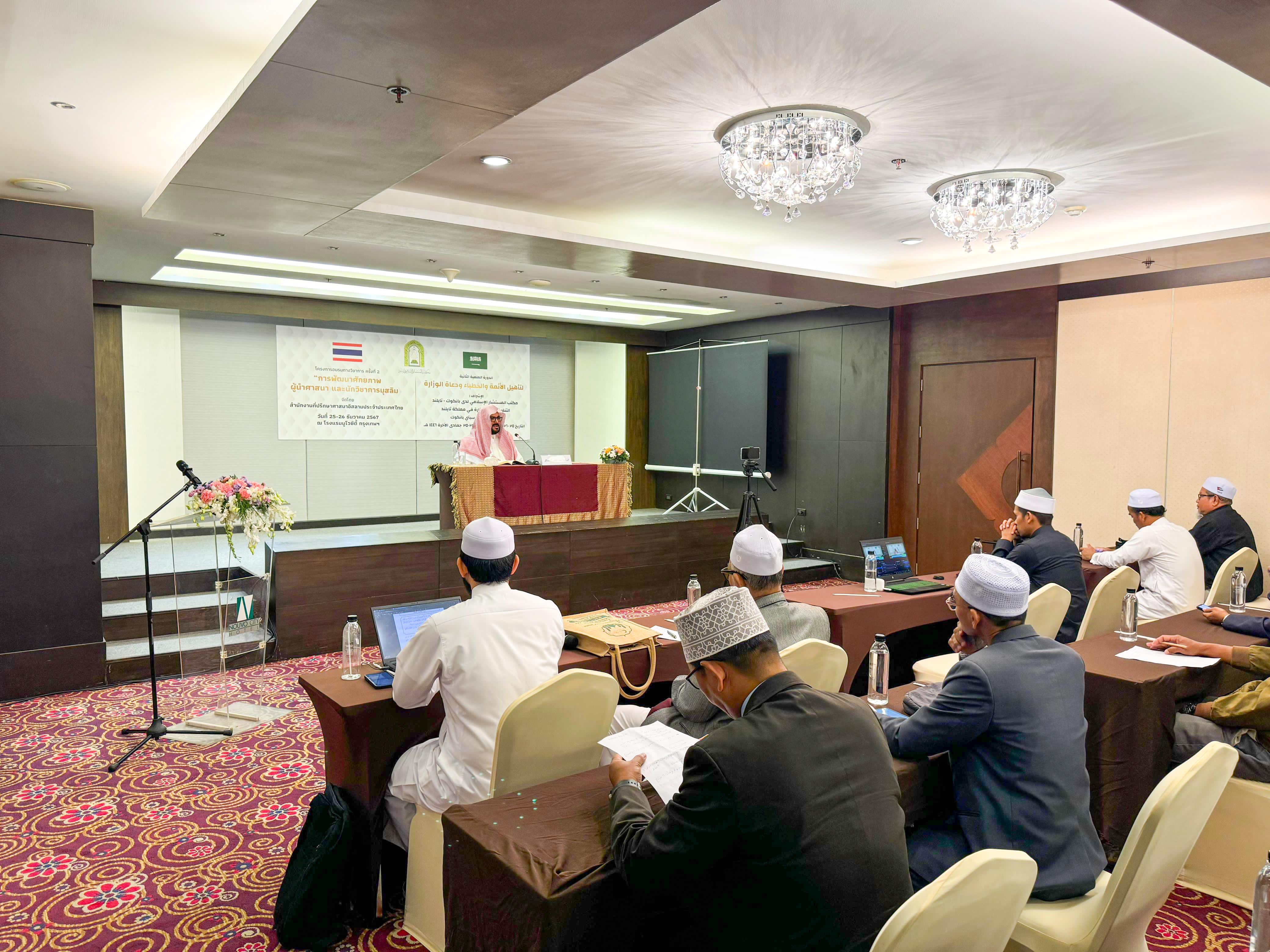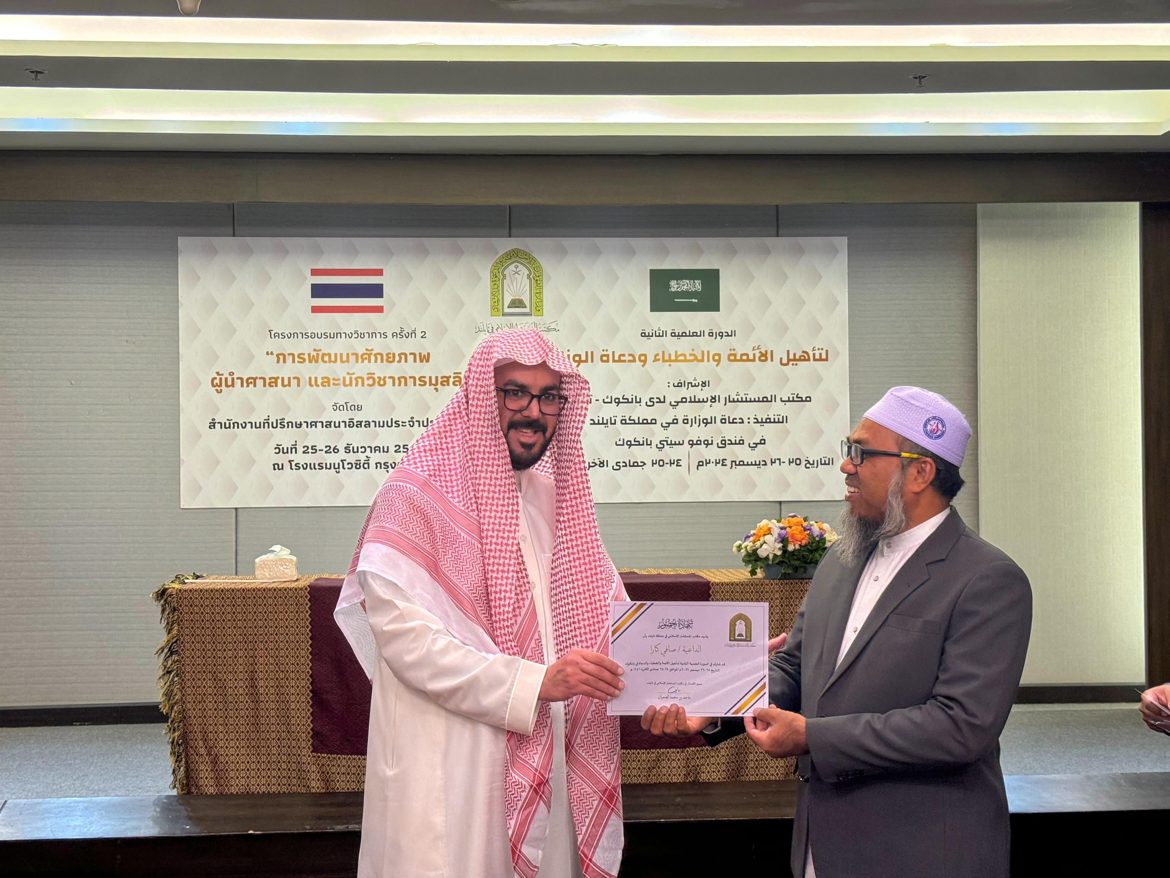 اختتمت وزارة الشؤون الإسلامية والدعوة والإرشاد، ممثلة بمكتب المستشار الإسلامي في مملكة تايلاند، اليوم الخميس، الدورة العلمية الثانية لتأهيل الأئمة والخطباء والدعاة، التي أقيمت في العاصمة بانكوك على مدار يومي الأربعاء والخميس، الموافق 25-26 ديسمبر 2024، وقدمها الشيخ الدكتور عبدالمجيد بن محمد العساكر، بمشاركة عدد من الأئمة والخطباء والدعاة.