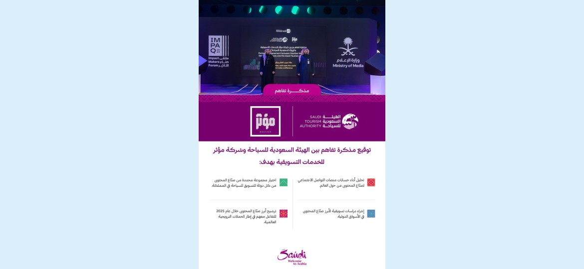 وقعت الهيئة السعودية للسياحة مذكرة تفاهم مع شركة مؤثر للخدمات التسويقية، إحدى الشركات المحلية الرائدة في هذا المجال، بهدف تعزيز الجهود للوصول إلى الشرائح المستهدفة في الأسواق الدولية، وترسيخ مكانة المملكة على خارطة السياحة العالمية.