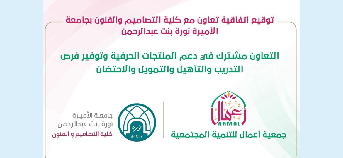 وقعت جمعية أعمال للتنمية المجتمعية، اتفاقية تعاون مشترك مع جامعة الاميرة نورة بنت عبدالرحمن ممثلة بكلية التصاميم والفنون ، ووقع الاتفاقية من جانب الجمعية الاستاذ عبدالرزاق بن عبدالله القشعمي الأمين العام لجمعية أعمال، وعن كلية التصاميم والفنون في جامعة الأميرة نورة بنت عبدالرحمن. الدكتورة مها بنت أمين خياط عميدة الكلية.