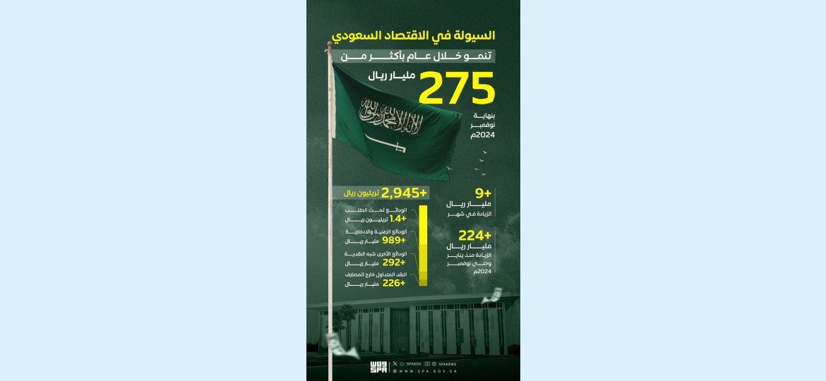 كما سجلت السيولة نموًا منذ بداية العام 2024م وحتى نهاية شهر نوفمبر من نفس العام، بقيمة تجاوزت الـ 224,699 مليار ريال وبنسبة 8.3%، مقارنة بـ 2,720,957 مليون ريال بنهاية شهر يناير.