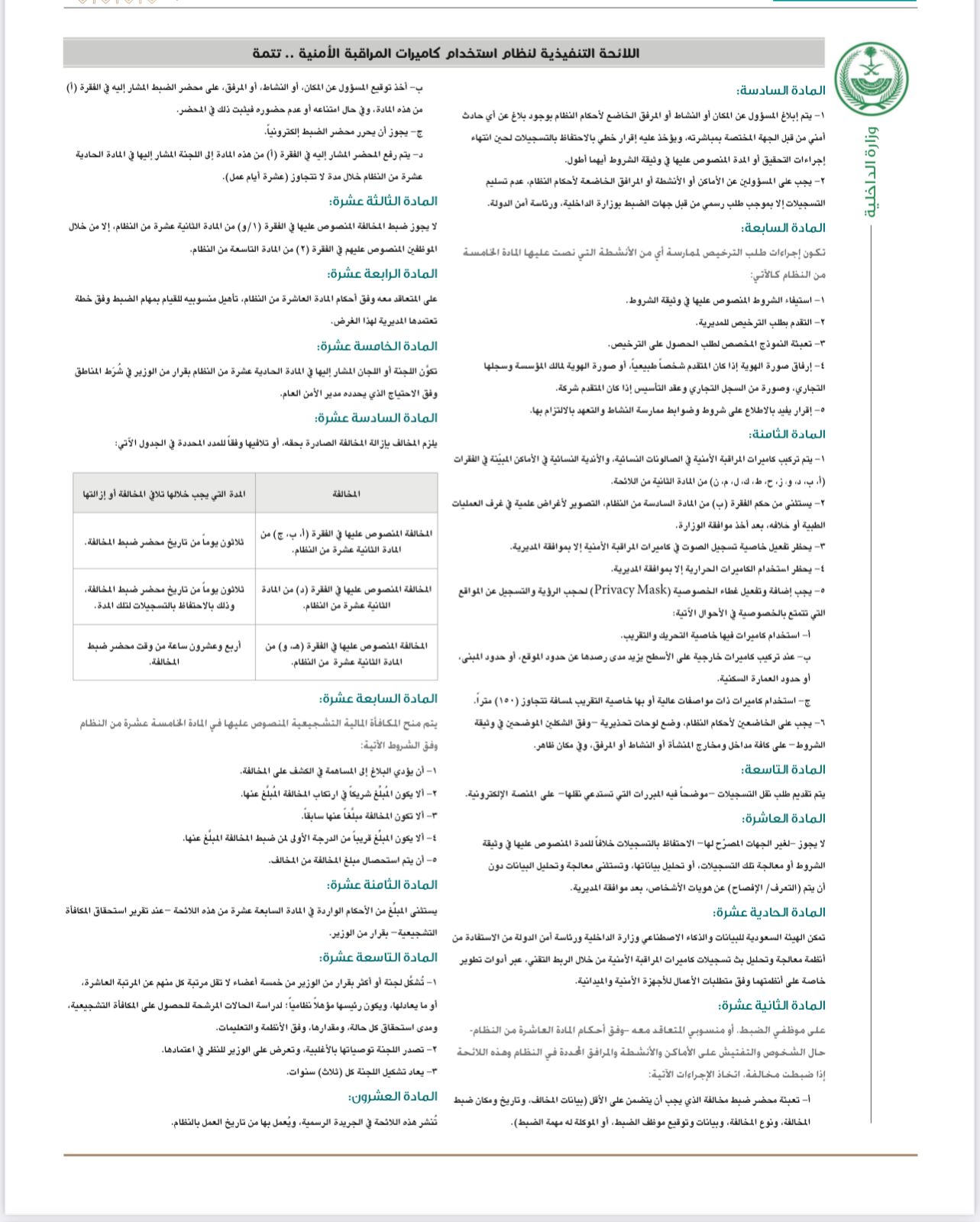 أعلنت وزارة الداخلية صدور اللائحة التنفيذية لنظام استخدام كاميرات المراقبة الأمنية ووثيقة الشروط والمتطلبات الأمنية لتركيب نظام المراقبة والمواصفات الفنية العامة لأجهزة أنظمة كاميرات المراقبة الأمنية.