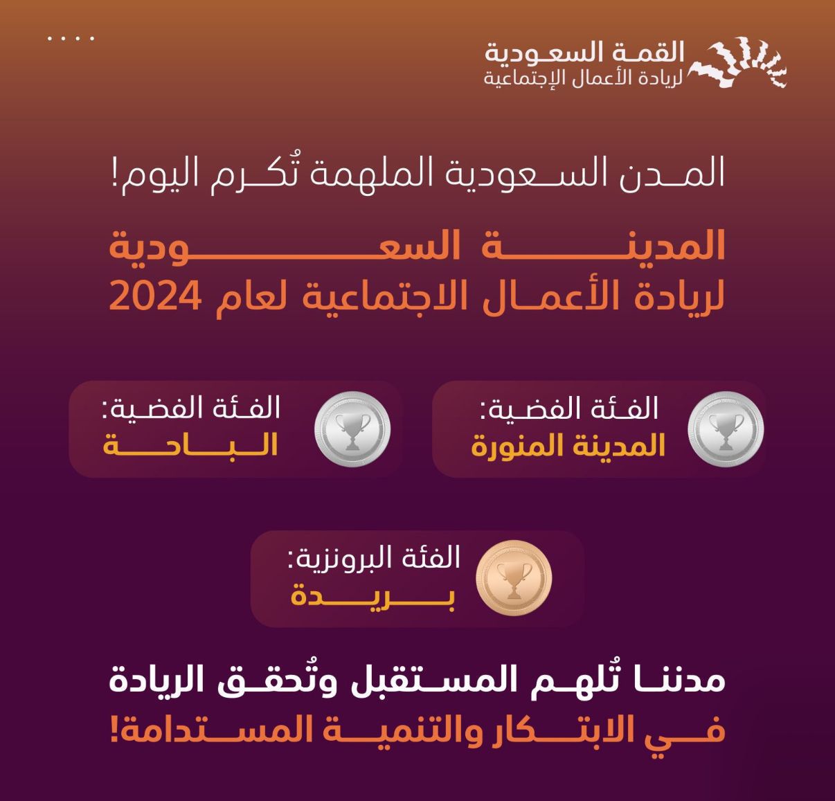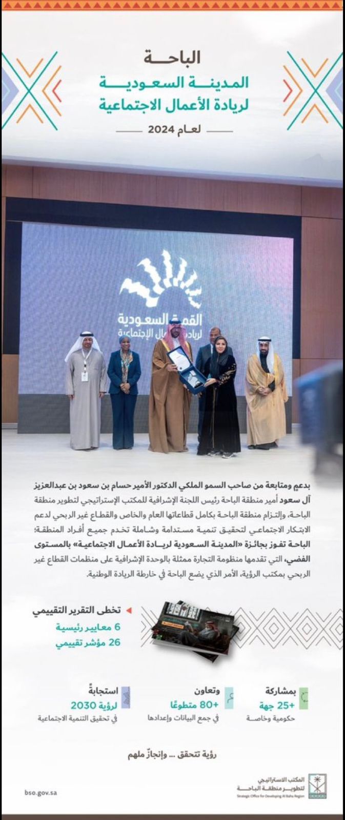 بدعم ومتابعة صاحب السمو الملكي الدكتور حسام بن سعود بن عبدالعزيز، أمير منطقة الباحة، حصلت منطقة الباحة على لقب “المدينة السعودية لريادة الأعمال الاجتماعية لعام 2024”، وذلك بفضل الجهود المتواصلة لتعزيز الابتكار الاجتماعي وتطوير مبادرات تنموية مستدامة تخدم مختلف القطاعات في المنطقة.