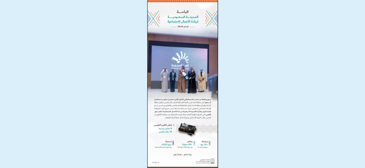 ويُعزى هذا التميز إلى التزام الباحة الكامل بتوحيد جهود القطاعين العام والخاص وغير الربحي لتحقيق رؤية المملكة 2030، وتعزيز مكانة ريادة الأعمال الاجتماعية على المستويين الوطني والعالمي.
