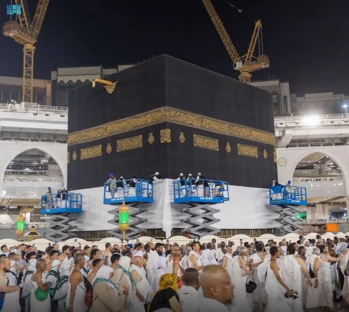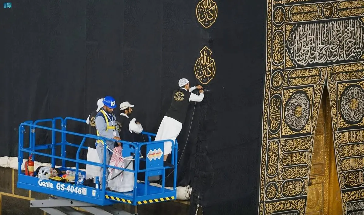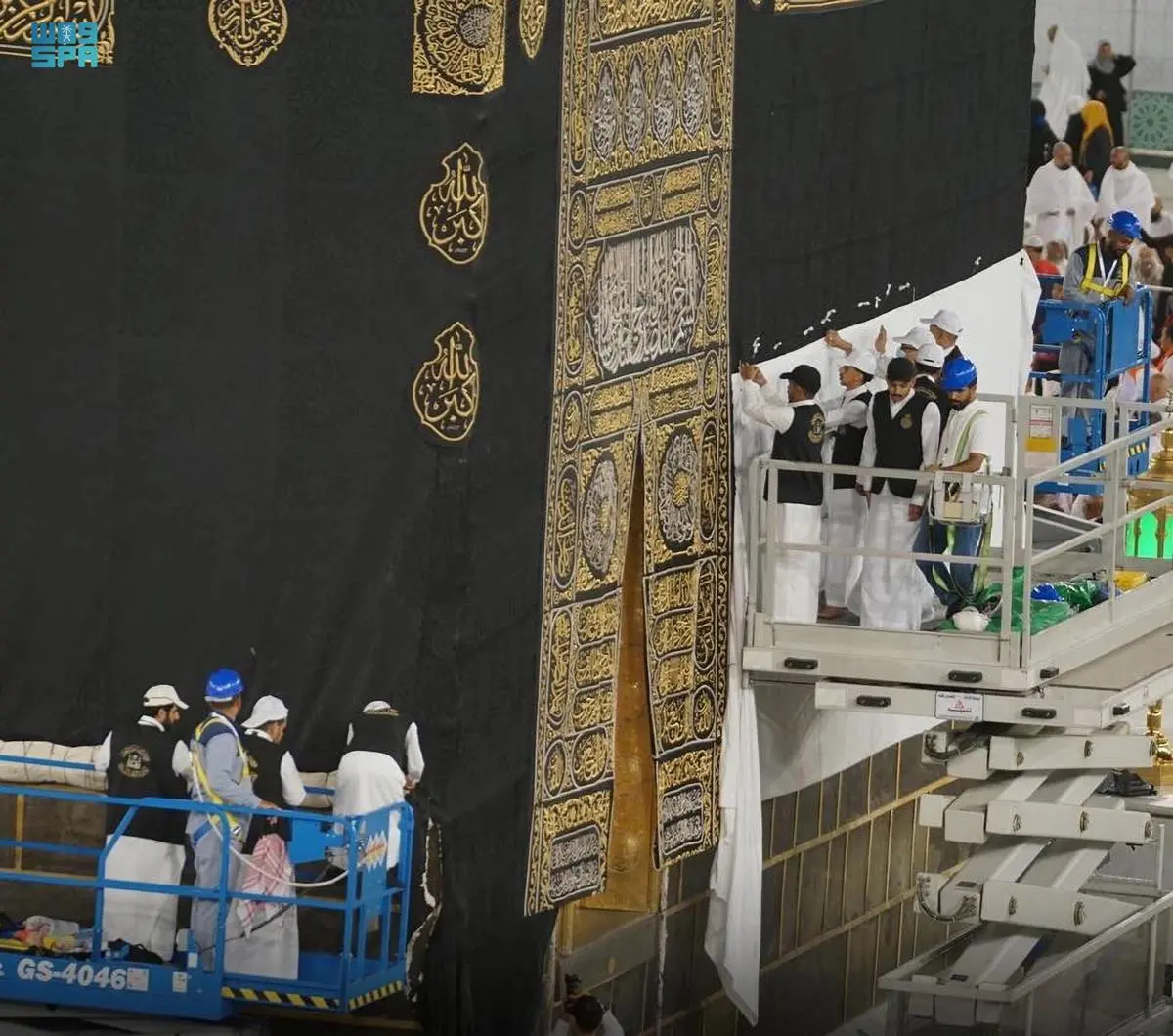 رفعت الرئاسة العامة لشؤون المسجد الحرام والمسجد النبوي - ممثلة بوكالة مجمع الملك عبدالعزيز لكسوة الكعبة المشرفة- اليوم،الجزء السفلي من كسوة الكعبة المشرفة بمشاركة معالي الرئيس العام لشؤون المسجد الحرام والمسجد النبوي الشيخ الدكتور عبدالرحمن السديس، جريًا على العادة السنوية بارتفاع ثلاثة أمتار وفق الخطة المعتمدة لموسم الحج، فيما تمت تغطية الجزء المرفوع بإزار من القماش القطني الأبيض بعرض مترين تقريبًا من الجهات الأربع.