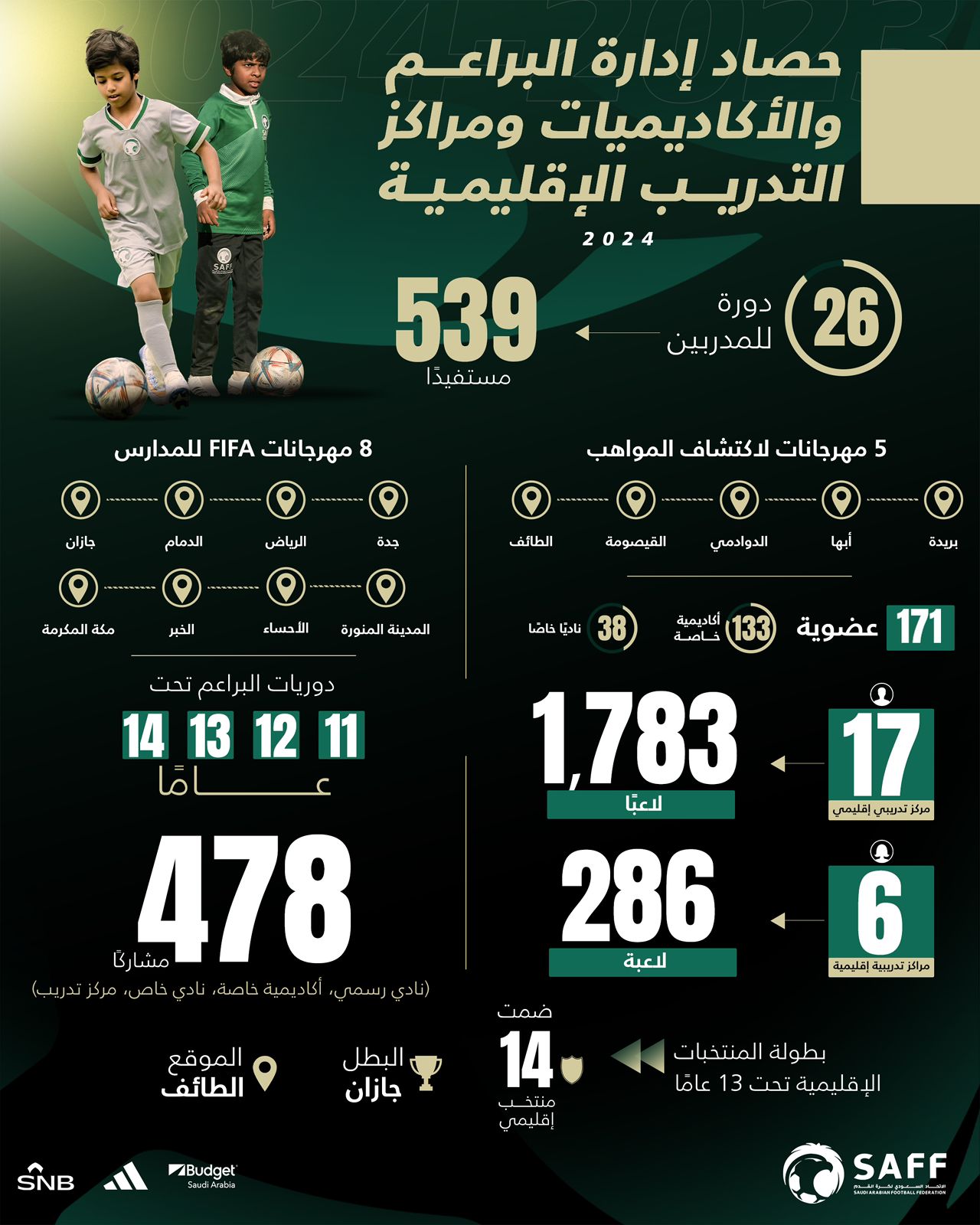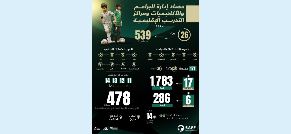 خطت إدارة البراعم والأكاديميات ومراكز التدريب الإقليمية خلال عام 2024 عددًا من الخطوات لتحقيق مستهدفات استراتيجية كرة القدم السعودية التي تم إطلاقها في سبتمبر 2021، وذلك في آخر المستهدفات المتبقية في المسار الفني قبل اطلاق النسخة الجديدة من الاستراتيجية التي تمتد من 2025 وحتى 2029.